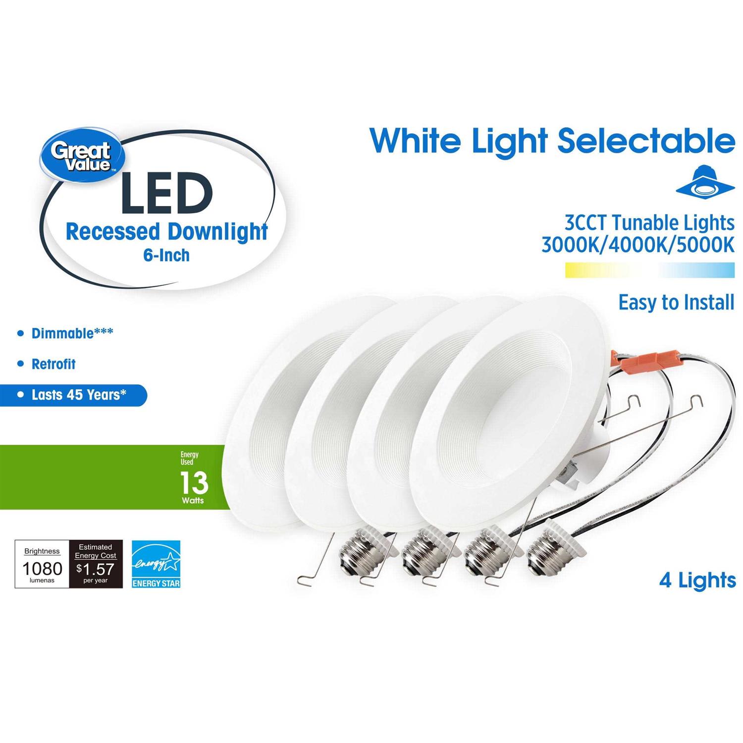 Great Value 6 inch LED Retrofit Downlight 13-Watt White Adjustable E26 base 4 Pack CA