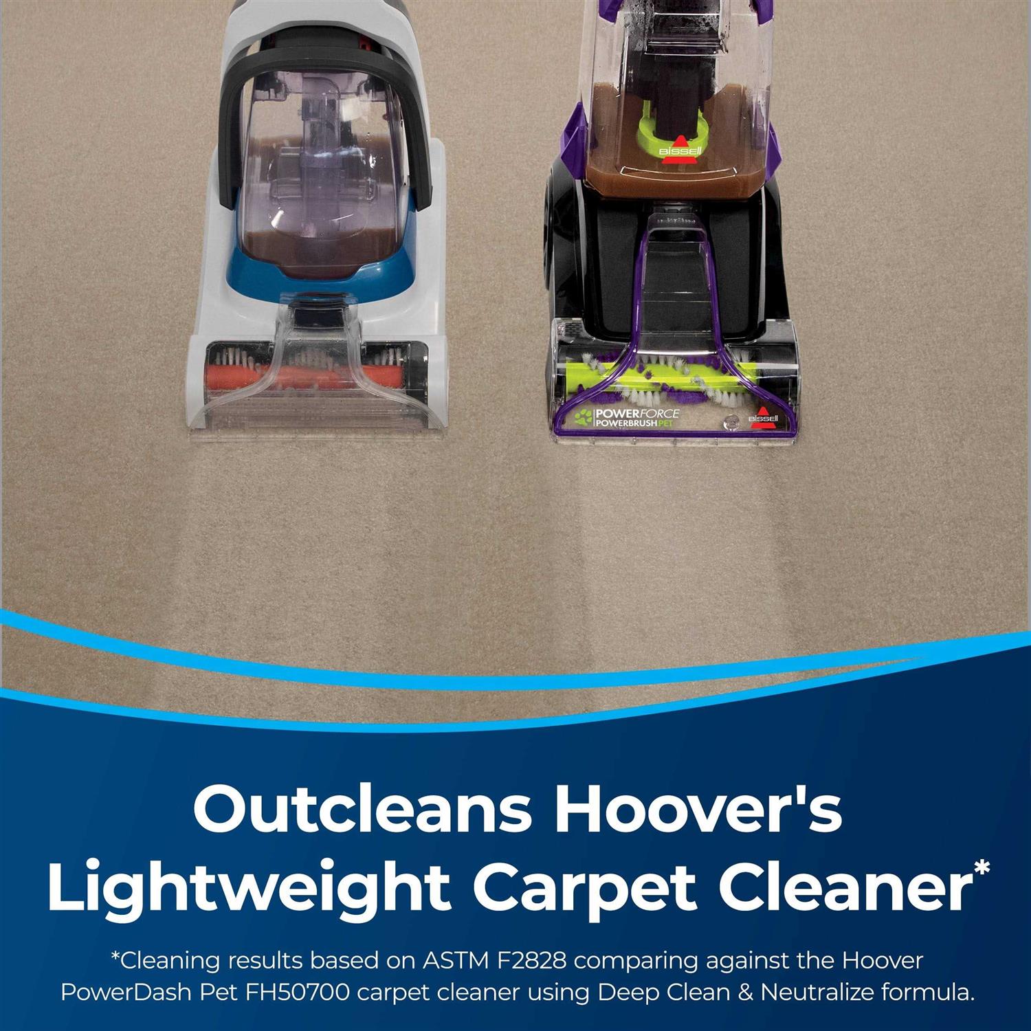 Dont let the sleek and lightweight design of BISSELL PowerForce PowerBrush Pet fool you this machine is tough on pet messes that occur on carpet and area rugs. The less than 13-pound machine packs a powerful cleaning punch. The four-row DeepReach PowerBrush works with BISSELL Advanced formula to remove pet messes like dog and cat urine vomit and mud. It’s easy to quickly grab if your pet has an accident on the area rug or tracks in mud from the backyard. Never put dirty water back on your carpet or area rugs with this machine’s two-tank system. Clean water and formula are kept in one tank while dirty water is pulled into a separate tank. PowerForce PowerBrush Pet is lightweight and powerful so it’s great for smaller living spaces that may have limited storage. When you’re done using it features like the easy-to-remove water tanks and a removable nozzle make maintenance simple. And this product doesn’t just easily clean up after pets it helps save them too BISSELL proudly supports BISSELL Pet Foundation and its mission to help save homeless pets. Were proud to design products that help make pet messes odors and pet homelessness disappear.