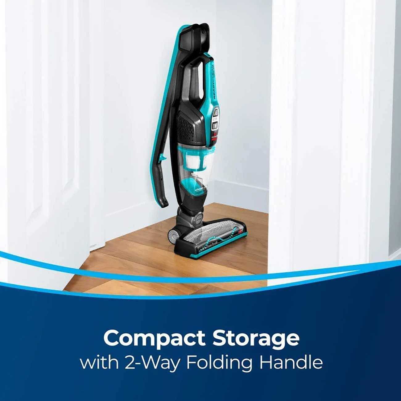 Bissell ReadyClean Electric Blue Cordless Stick Vacuum is meant for quick, hassle free cleaning on a variety of different floor surfaces. The 10.8V Lithium-Ion Battery provides you with up to 20 minutes of cordless cleaning when fully charged for 4.5 hours. Its multi-surface brush roll can easily be turned on or off depending on the floor type, transforming this vacuum from a hard surface to a low pile carpet vacuum. With a lightweight design and swivel steering, you can easily maneuver this vacuum around furniture and other obstacles that may be on your floor. Its cordless convenience makes this perfect for quick pickups, especially with its removable hand vacuum that can take care of messes above your floors to meet all your vacuuming needs. The two way folding handle folds in to adapt and clean under furniture and also folds down for easy storage in smaller spaces. Weighs 5.8 lbs.