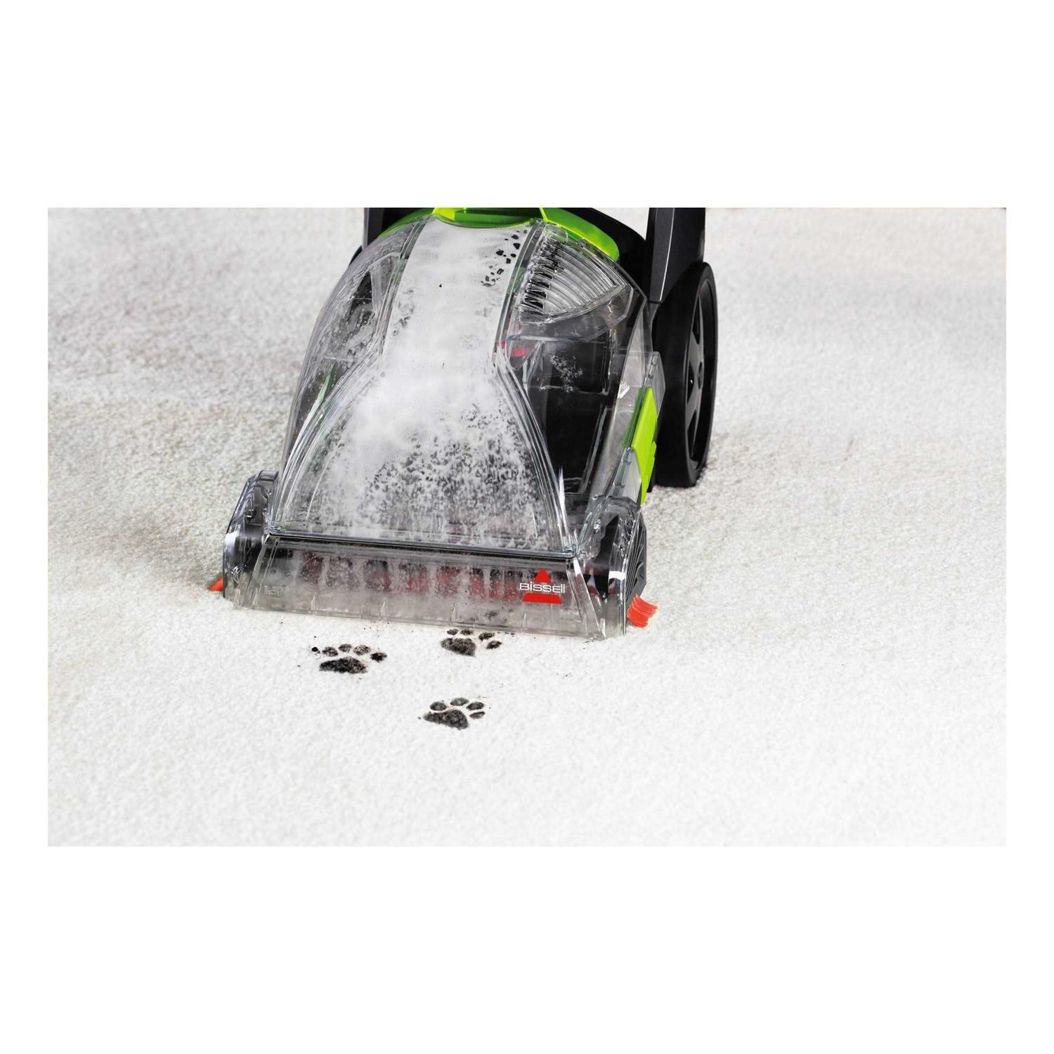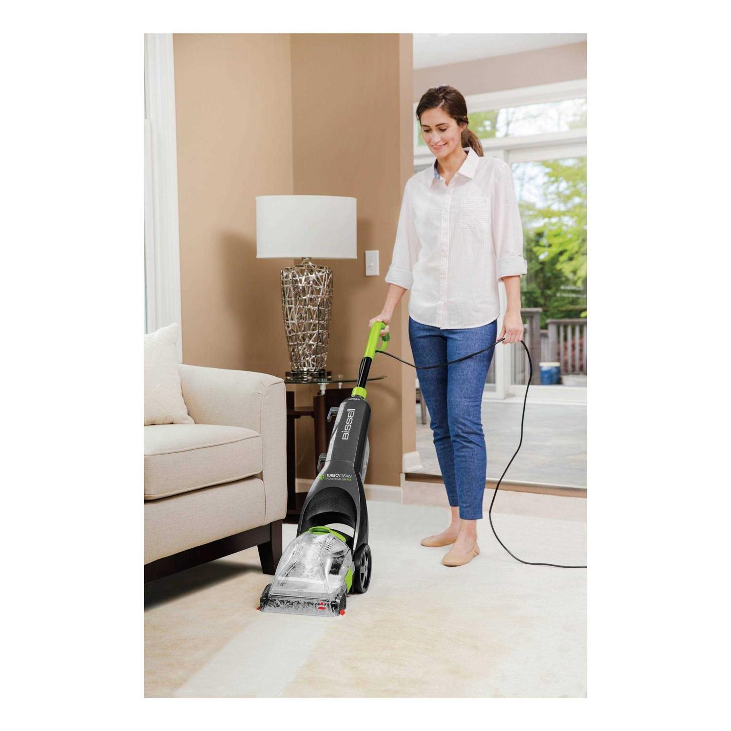 Bring rugs and carpet back to life with this Bissell TurboClean PowerBrush pet carpet cleaner. Rotating DirtLifter PowerBrush combined with powerful suction scrubs stains and lifts deep down dirt Lightweight convenience Easy to maneuver and carry so you can quickly clean up pet messes Convenient handle that collapses for storage, making the machine compact to fit into small spaces for storing Powerful BISSELL Oxy-based Formula to remove stains like coffee, wine, grape juice, and pet stains Two tank system keeps clean and dirty water separate Cleanup is easy with a nozzle that can be detached and rinsed off at your sink before putting away While carpet cleaning, the EdgeSweep bristles can clean along the baseboards and around furniture 45″H x 9.8″W x 17.3″D.