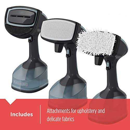 Erasing wrinkles from clothing and freshening up fabrics is a breeze with the BLACK+DECKER Advanced Handheld Steamer. With 1400 watts of power and a preheat time of less than a minute, this steamer delivers quick and effective wrinkle-fighting performance, producing 45% more steam than the Conair GS23 Series*. The locking trigger lets you apply steam continuously or in small bursts, plus three attachments are included for removing lint, and steaming upholstery and delicate fabrics. So handy to use, its perfect for deodorizing and refreshing bedding, drapes and plush toys, and steam cleaning heat and moisture tolerant hard surfaces such as high chair trays and kids play surfaces as a chemical free alternative. The BLACK+DECKER Advanced Handheld Steamer puts the power of steam into a lightweight appliance for quick, everyday use, keeping your fabrics wrinkle-free and household steam fresh.*45% more steam than the Conair GS23 Series based on 3rd party testing, July 2016.