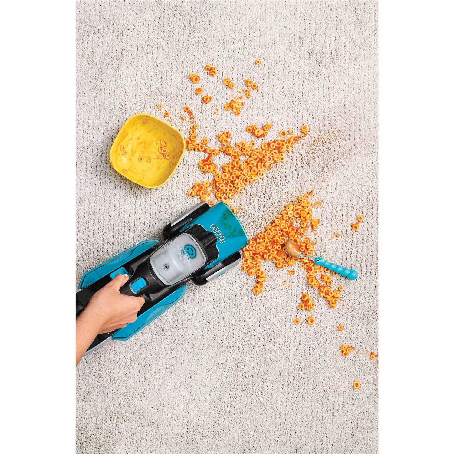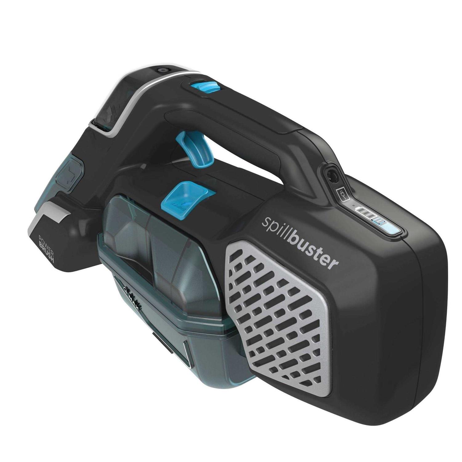 Carpet Cleaning Machines by BLACK+DECKER. Details:When it comes to the BLACK+DECKER spillbuster cordless spill + spot cleaner, no elbow grease is required. This portable, handheld vacuum cleaner is optimized for quick pickups of wet, chunky messes, including cereal and pet food spills, mud, and more. Use the spillbuster on carpet, rugs, upholstery and other surfaces throughout your home. The 3-step cleaning process is simple to follow and yields results in seconds. First, vacuum solid and soggy debris—the wide nozzle really comes in handy during this step. Next, spray any stains using the built-in formula dispenser, then use the powered scrub brush to lift stubborn stains out of the material. When the mess is all gone, you can empty the easy-collection bowl in the trash and wash it in the sink or dishwasher. The spillbuster is even designed with a battery indicator light, so you’ll always know when it’s fully charged and ready to go.