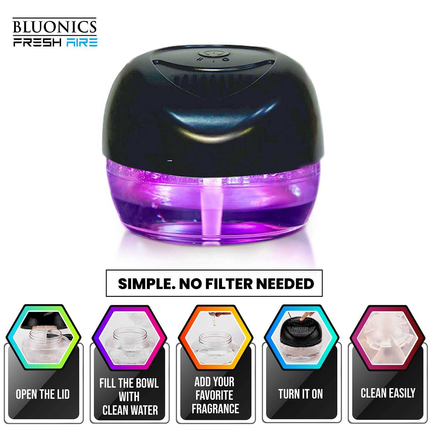 FRESH BREATH Experience the refreshing power of our water-based air revitalizer. The air purifier with water acts as a filter, trapping particles and releasing fresh moist air into your room. This water air purifier enhances your home air with a water-based air revitalizer, creating fresh and healthy water-washed air. Boost your focus, freshen up your surroundings, and relax. HIGHLY EFFECTIVE Our air purifier with water filtration is effective for home. This purifier air washer is perfect for bedrooms, living rooms, kids’ and baby rooms, nurseries, offices, bathrooms, warehouses, etc. Breathe easy with our effective air washer. PROTECT YOUR LOVED ONES Say goodbye to unwanted odors, secondhand smoke, and pet dander with our efficient water air purifier. Designed for both large and small rooms, be it your bedroom, living room, or office, it banishes unpleasant smells. The ultimate choice for smokers and pet owners, our water-based air purifier is here to keep your space fresh and clean. RELAX WITH WHITE NOISE & LED NIGHT LIGHT Our water air purifier features a soothing night light design with 7 mood-enhancing colors, give you a peaceful of night. This water air freshener is a favorite white noise machine for both kids and adults. Plus, this compact water purifier is a great choice for keeping your family safe from asthma and breathing issues. CUSTOMIZE YOUR SCENTS Enhance your home air purifiers with fragrance by adding 2-3 drops of your preferred fragrance or essential oil, transforming it into an aromatizer that fills your space with refreshing scents. Please note that fragrances are sold separately. Discover our fragrance options using ASIN: B09MV4639W. EASY TO MAINTAIN Simply change the water and clean the bowl every time you want to use the machine. Occasionally remove the middle shaft and clean it with water and soap. With this scented air purifier, you can easily dispose of the water, ensuring daily refreshment with fresh water and oils. Bluonics Fresh Aire machine is a water-based air purifier, which in many ways, is another variation of an air purifier