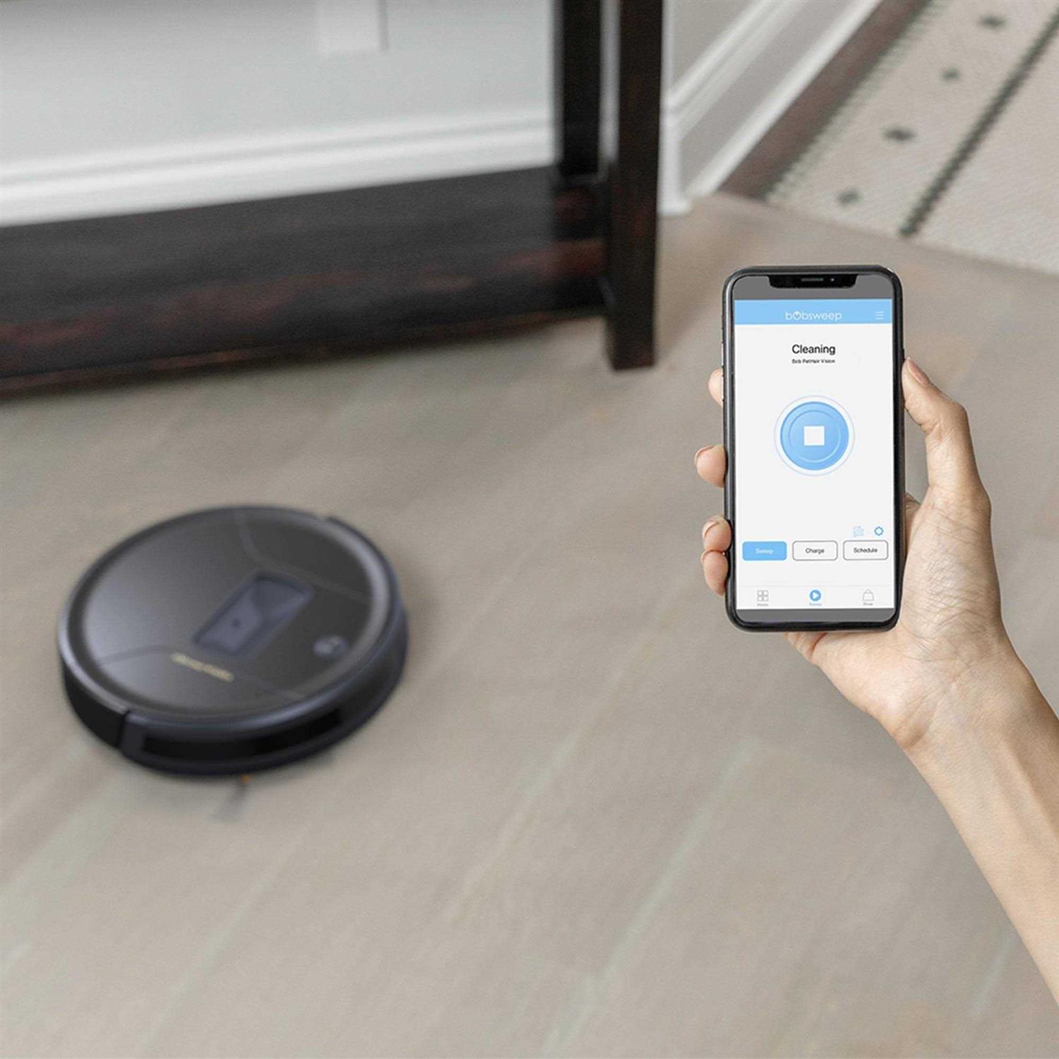 Clean up your house from the comfort of your couch with this bObsweep PetHair robotic vacuum cleaner. Wi-Fi connectivity lets you schedule cleaning tasks from anywhere via your smartphone. This bObsweep PetHair robotic vacuum cleaner automatically returns to the charging dock when power gets low and can hold up to 600ml of dust and debris. Voice control enabled Connect bot to Alexa or Google Assistant, and you can command him with your voice. Mobile app Allows you to schedule, control, and track your bot. Available on the App Store and Google Play. VisiOn camera Scopes out the environment as Bob cleans. Scheduling Sends Bob to clean on a custom routine. Can be set on the bObsweep app.