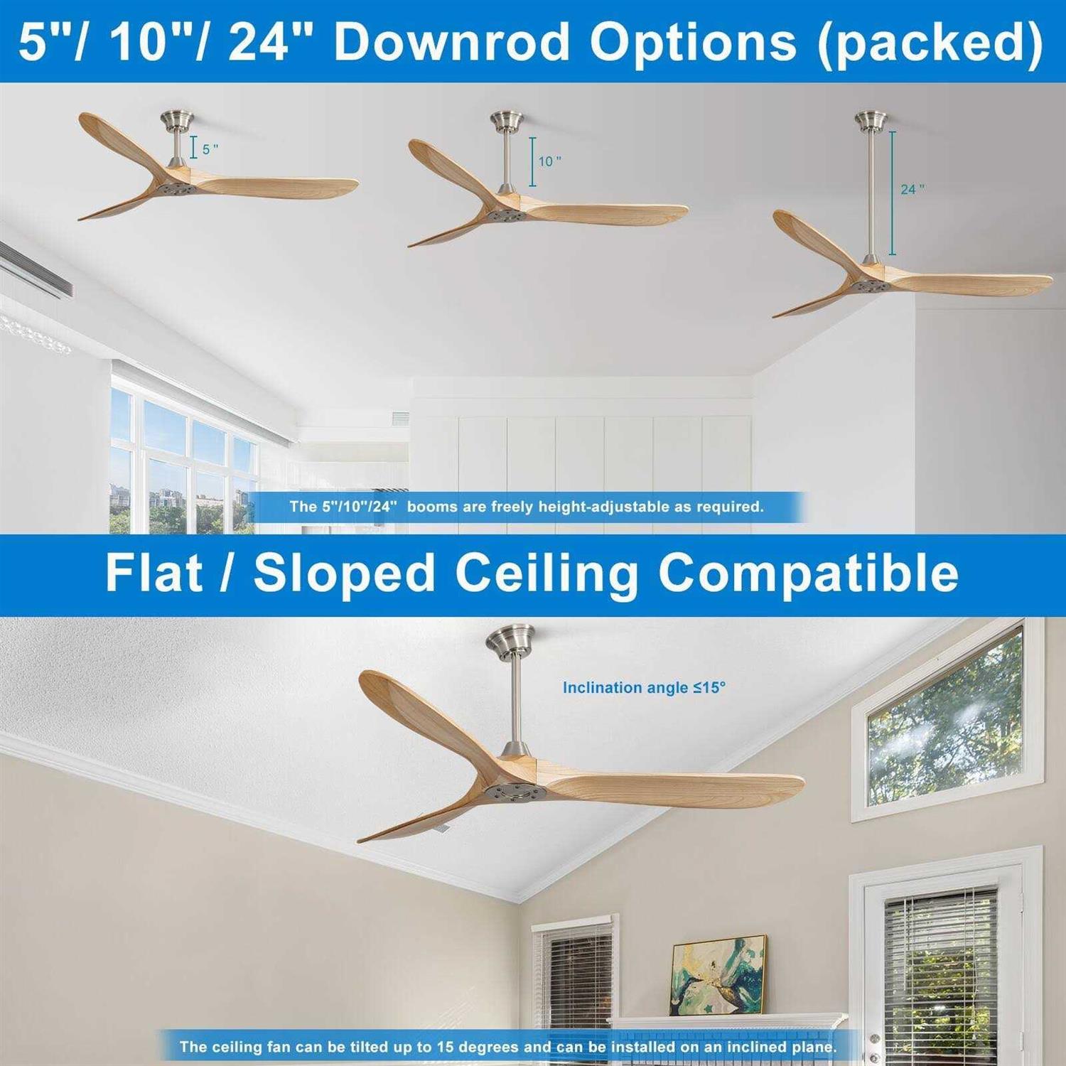 60 Inch ceiling fan without light with the minimalist look and slightly curved blades will match your different decor styles, modern, farmhouse and industrial, and so on. The Blades are made from solid wood. This modern ceiling fan can provide great air movement. With a 35W DC reversible motor, this fan has a super quiet performance, no need to endure the noise while saving energy both in the summers and winters. Easy to control the fan by remote control.