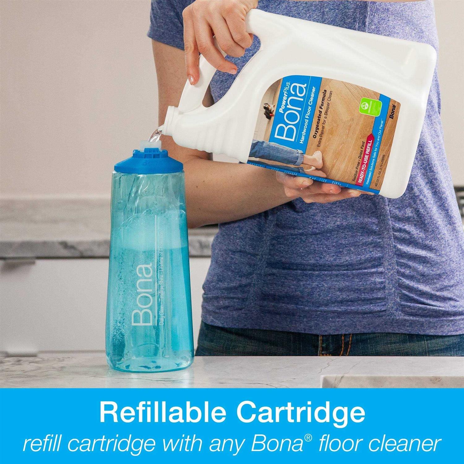 The Bona PowerPlus Premium Motion Spray Mop for Hardwood Floors is an all-in-1 battery powered solution to deep clean wood floors. Stuck on messes are no match for this premium spray mop, equipped with a vibrating mop head that delivers sonic action to loosen dirt and debris. Includes Bona’s PowerPlus oxygenated residue-free deep cleaner in a refillable cartridge and a deep cleaning washable microfiber pad. To refill, remove the cartridge with a push of a button. The flat bottom and wide opening allow for an easy refill and the cartridge clicks back into place. The extra-large mop head delivers quick and effective cleaning, and the flexible rubber corners protect baseboards and furniture from dings and scratches. A secondary grip provides comfort when cleaning those areas that need a little more scrubbing. The retractable hook allows for quick storage up and out of the way. Locking strips on the bottom of the mop head keep the cleaning pad attached during use. Soft microfiber won’t scratch your floor and the Bona PowerPlus Microfiber Deep Clean Pad features patented PowerLoop technology that gently breaks apart and loosens tough dirt build-up, while the dual-zone microfiber traps and locks dirt away. Features a special antimicrobial treatment to prevent odor-causing bacteria from growing on the pad that lasts for 50 washes. This reusable cleaning pad can be washed up to 500 times before needing to be replaced.