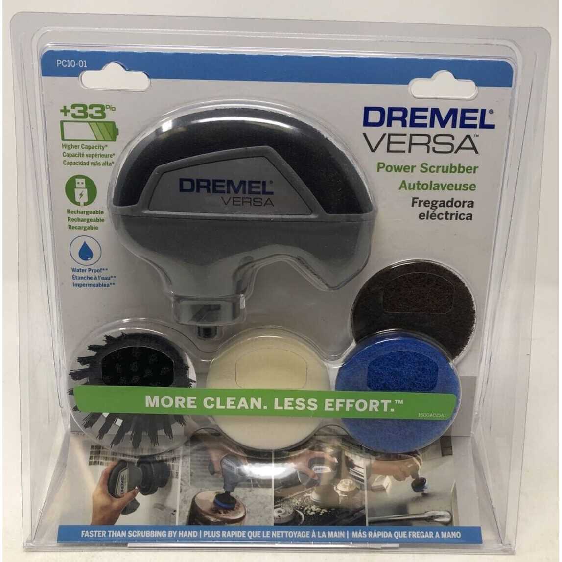 Tough cleaning jobs are a thing of the past with the powerful and versatile Dremel Versa. High-speed scrubbing, in a compact size, is ideal for tackling soap scum, baked on food, difficult grease, dirt and much more. The Lithium-Ion battery charges fast and is perfect for indoor and outdoor, dry and wet uses. The light-weight and compact design is ideal for single hand use and to tackle hard to reach places. Accessories changes are fast with the hook and loop interface. Switch from tile to glass, or upholstery to metal in no time, and use the Dremel Versa with or without water and cleaner based on the application.