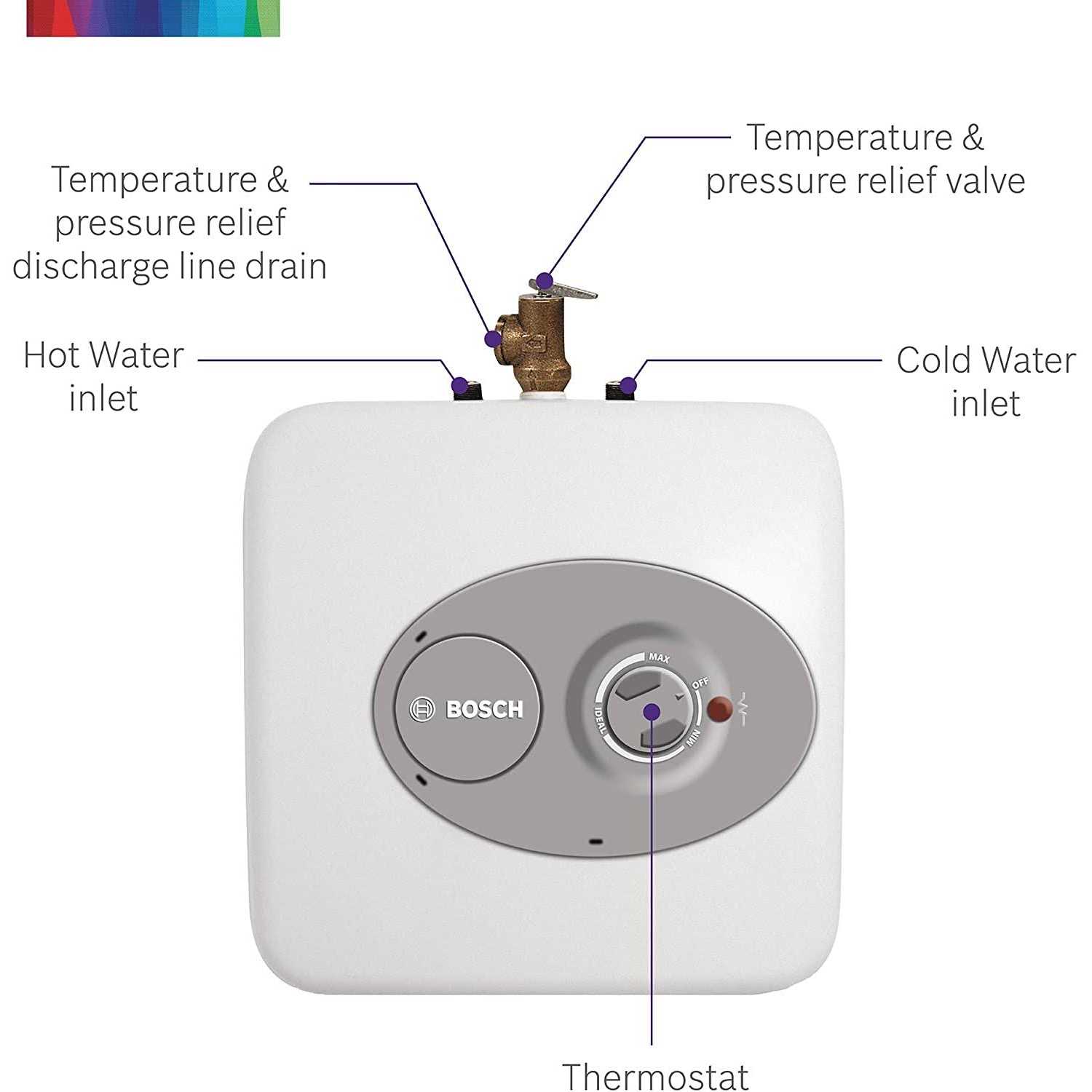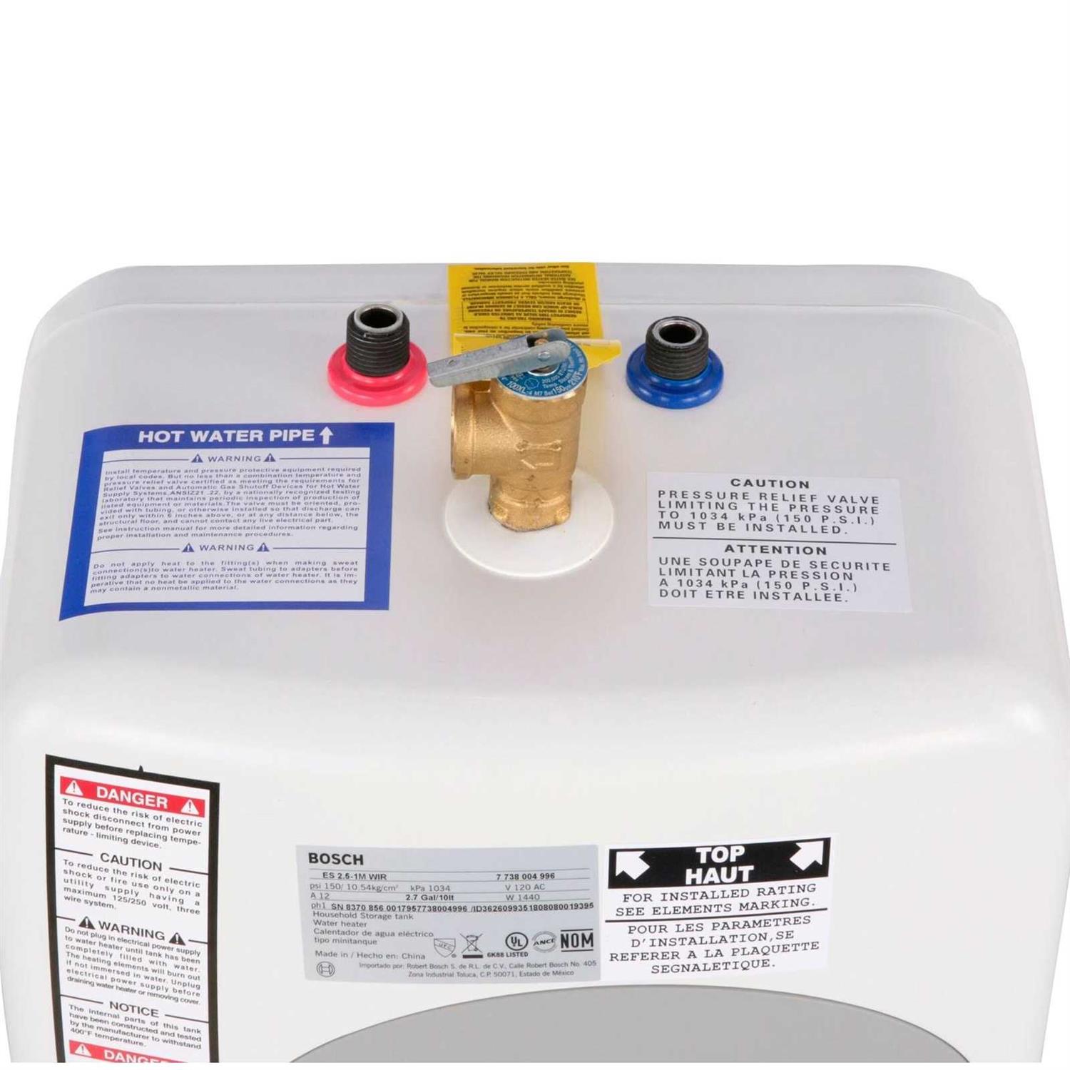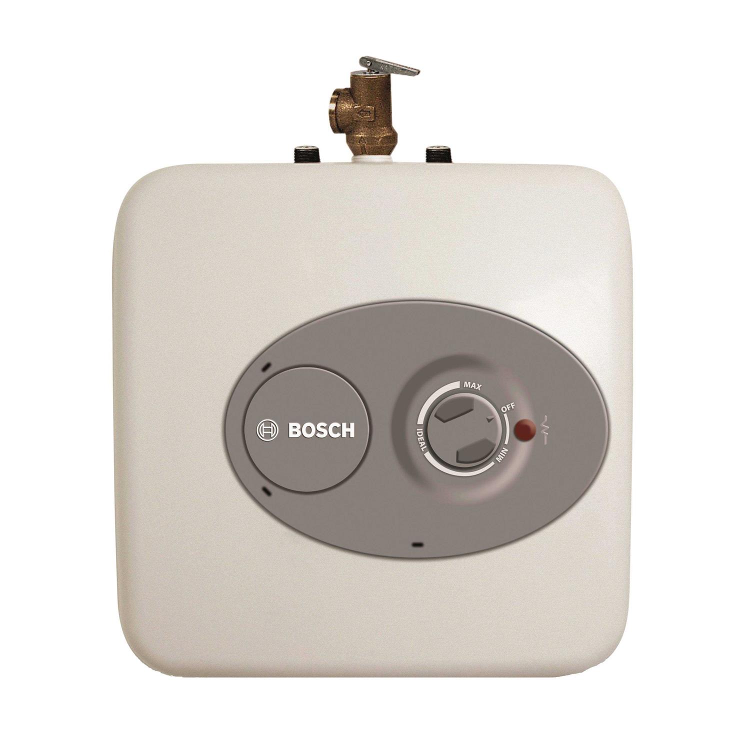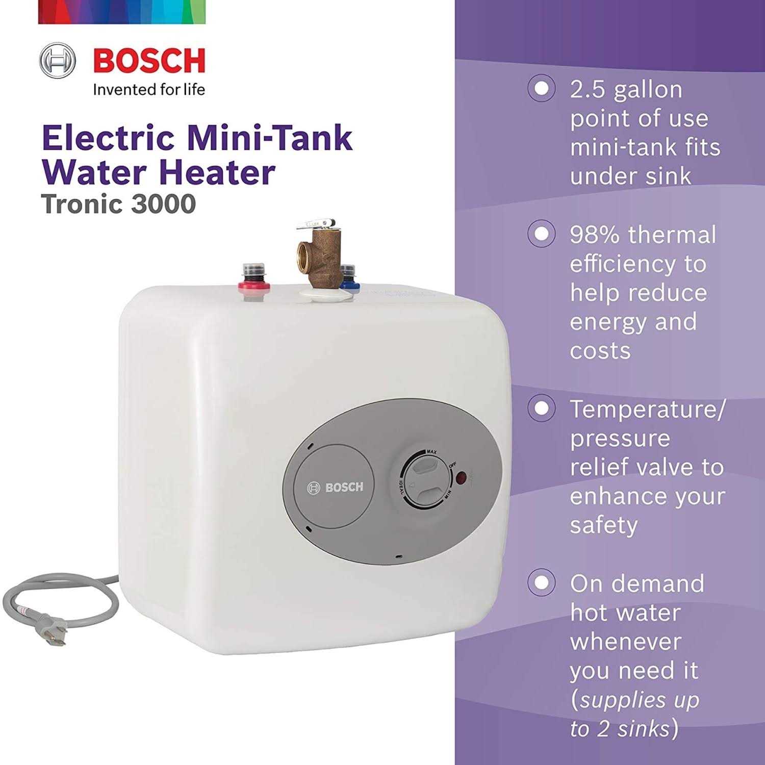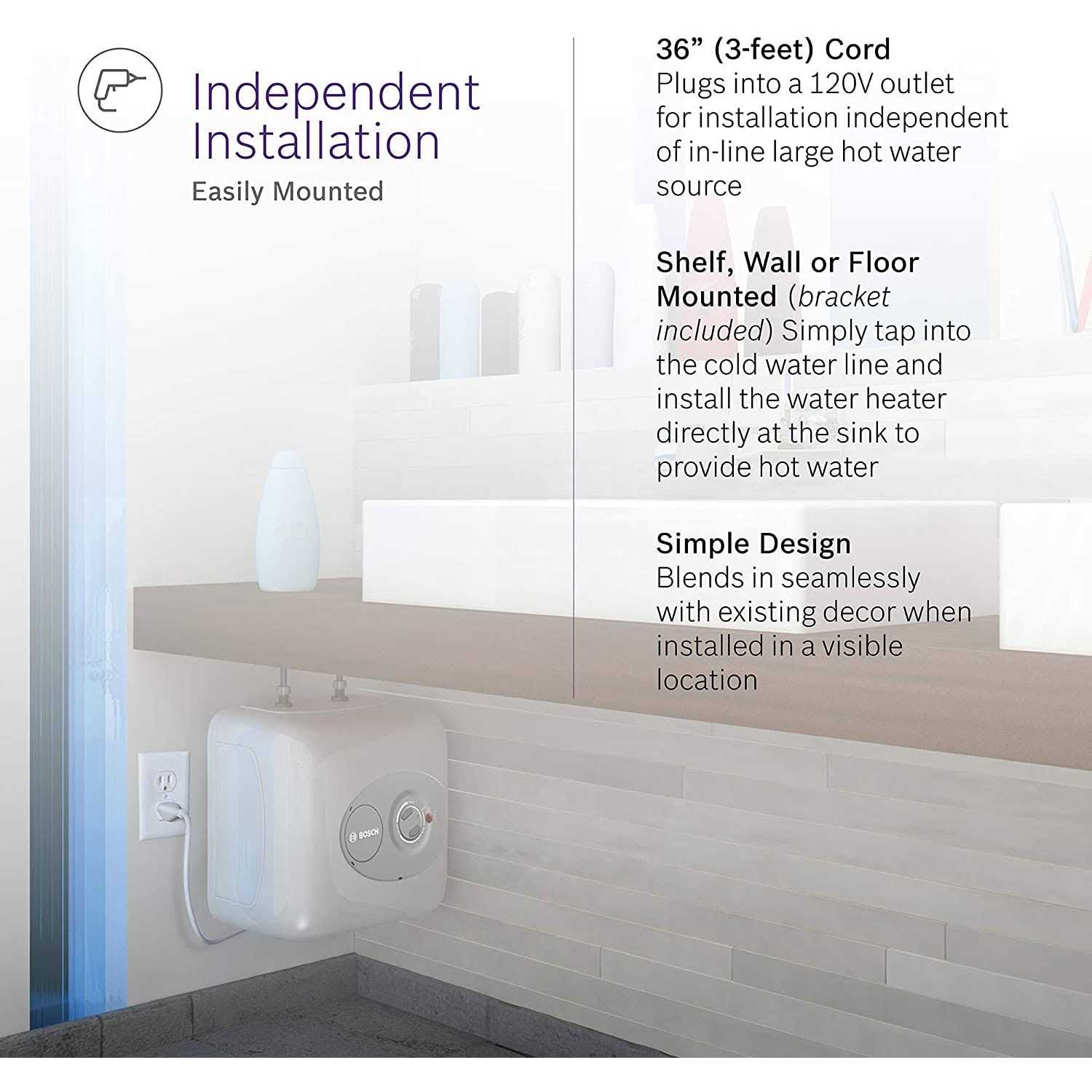 The Bosch 2.5 gal. electric water heater has a 2.5 gal. mini tank that fits under your sink to provide hot water right where you need it- at the point of use. Lightweight and compact. These water heaters are aesthetic on the outside, glass-lined on the inside and offer superior insulation for higher efficiency. The heater plugs right into a 120 volt outlet and has a lightweight, compact design that’s easy to handle and install. A glass-lined tank offers great insulation, while the heater’s fast recovery rate eliminates long waits for hot water. A temperature-and-pressure relief valve enhances your safety.