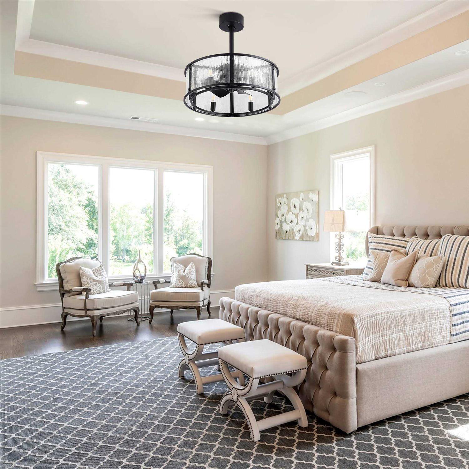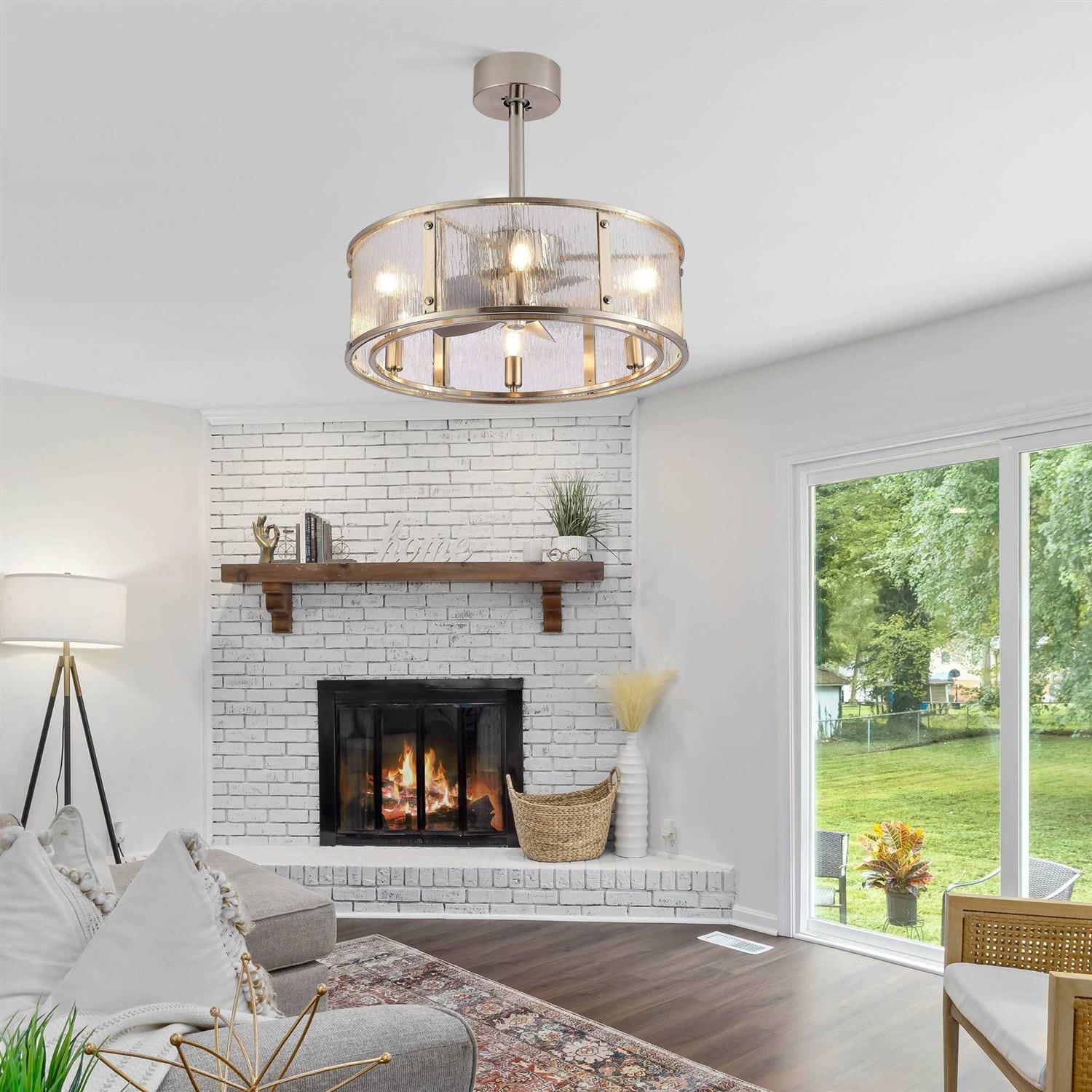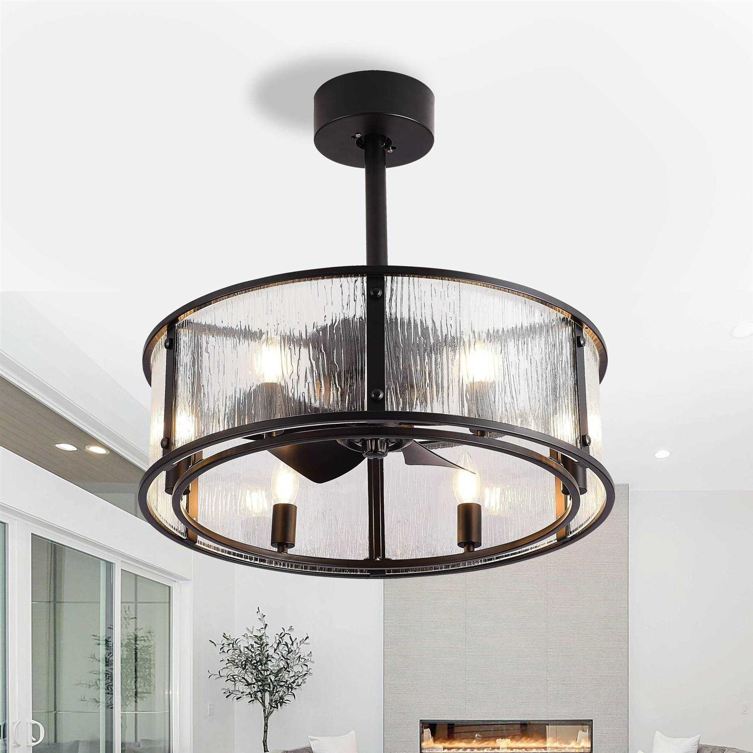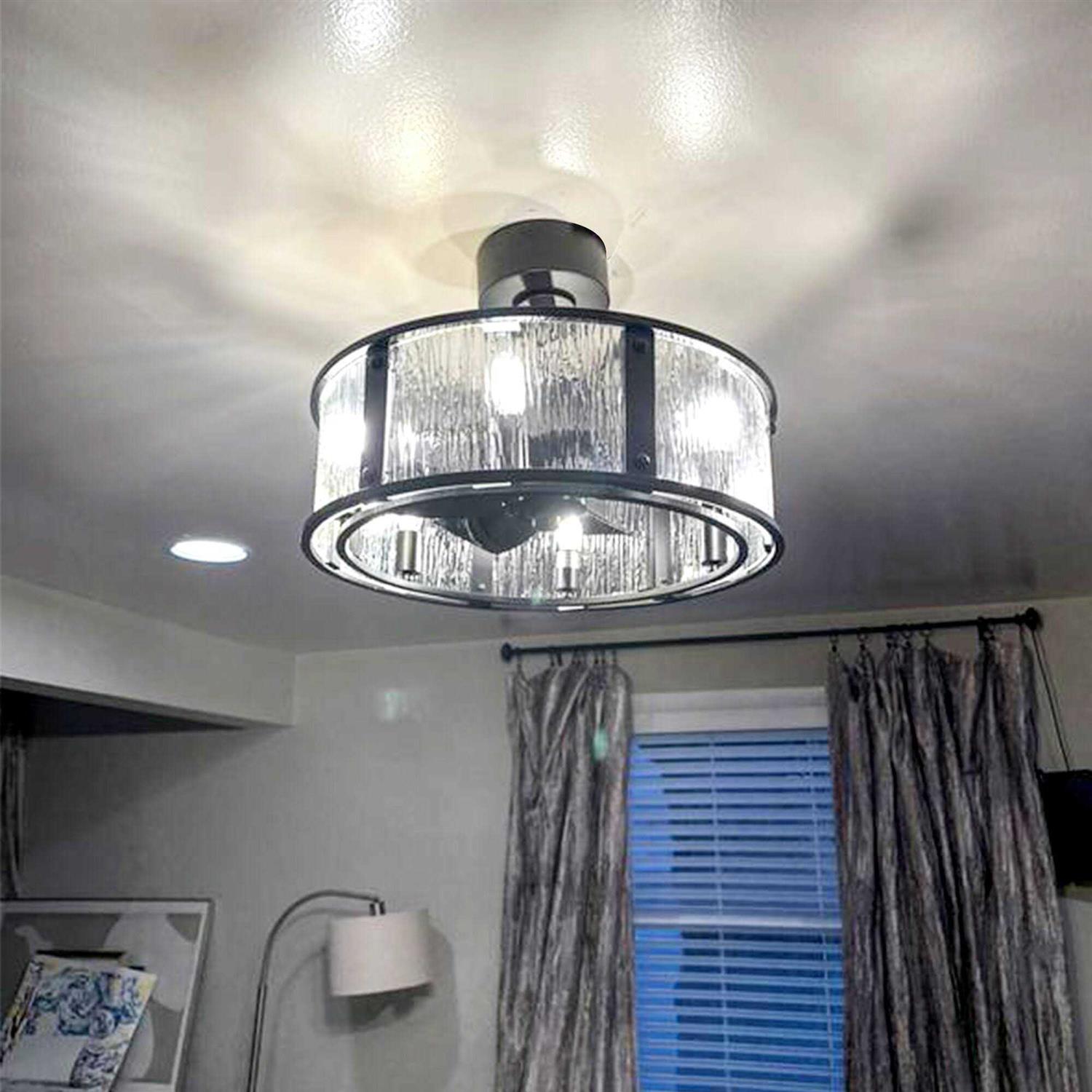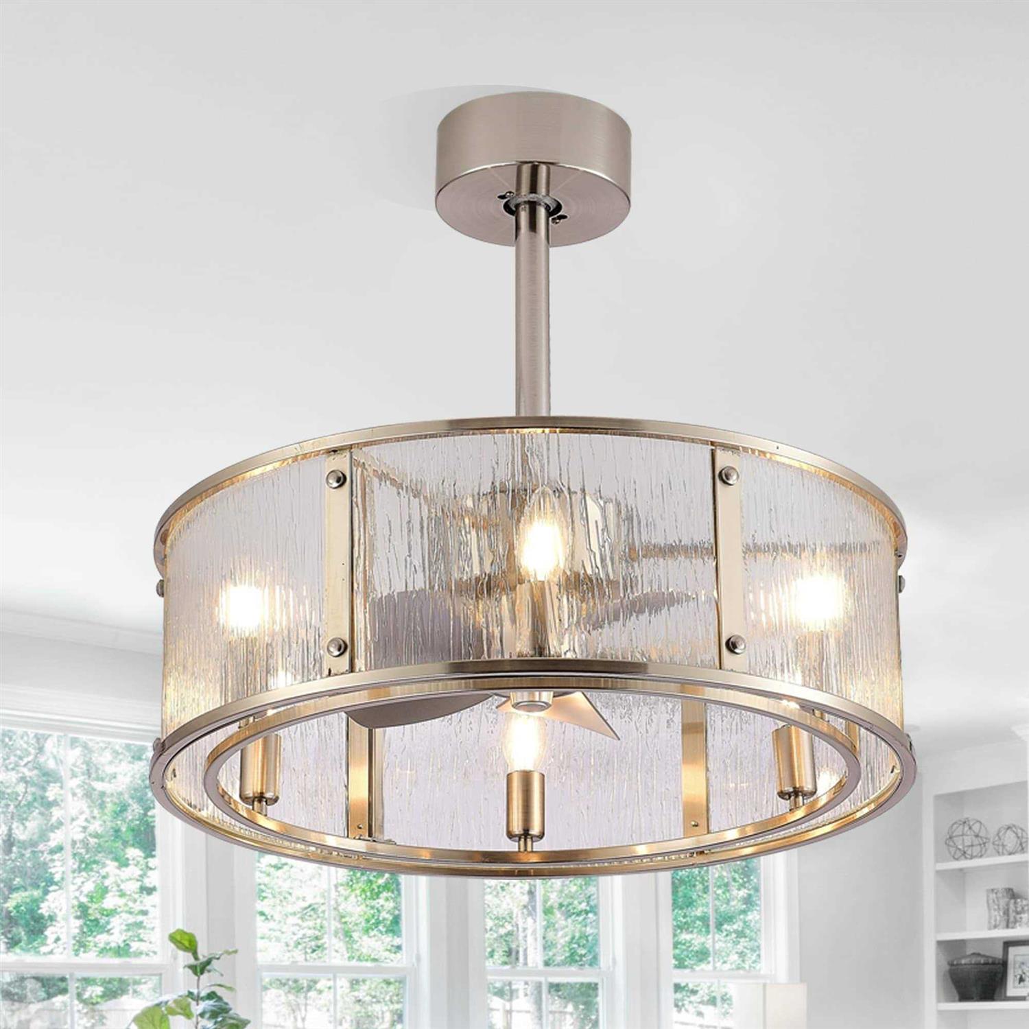 Upgrade any room with our stylish and energy-efficient 20 inch Modern 5-Blade Caged Ceiling Fan. The chandelier-style design, combined with a 12.5-degree blade pitch, evenly distributes air while providing an eye-catching focal point. The fan includes a light kit for the perfect ambiance and a remote control for easy operation. Features: Style: Contemporary Formal/Glam/Vintage Materials: Metal, Glass