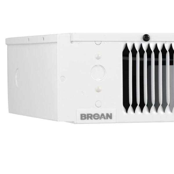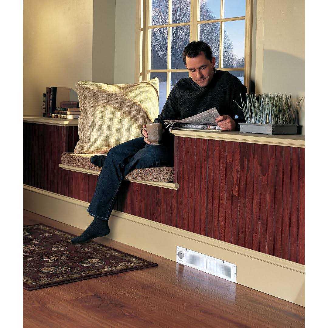 Broan 114 Kick Space Heater, 1500W Without Built-In Thermostat – Model 114 Slim trim and compact, yet powerful. Perfect for cabinet kickspaces, vanity bases, stairways or any place where space is limited. Also ideal for light-commercial applications like ticket/toll booths and checkout counters. Steel-Sheathed, Plate-Finned, Heavy-Duty Heating Element Factory Wired For 1500W At 240Vac, Easily Converts To 750W Or 1500W At 120V Attractive White Grille Use Model 90 Accessory Built-In Thermostat If Desired Without Thermostat White