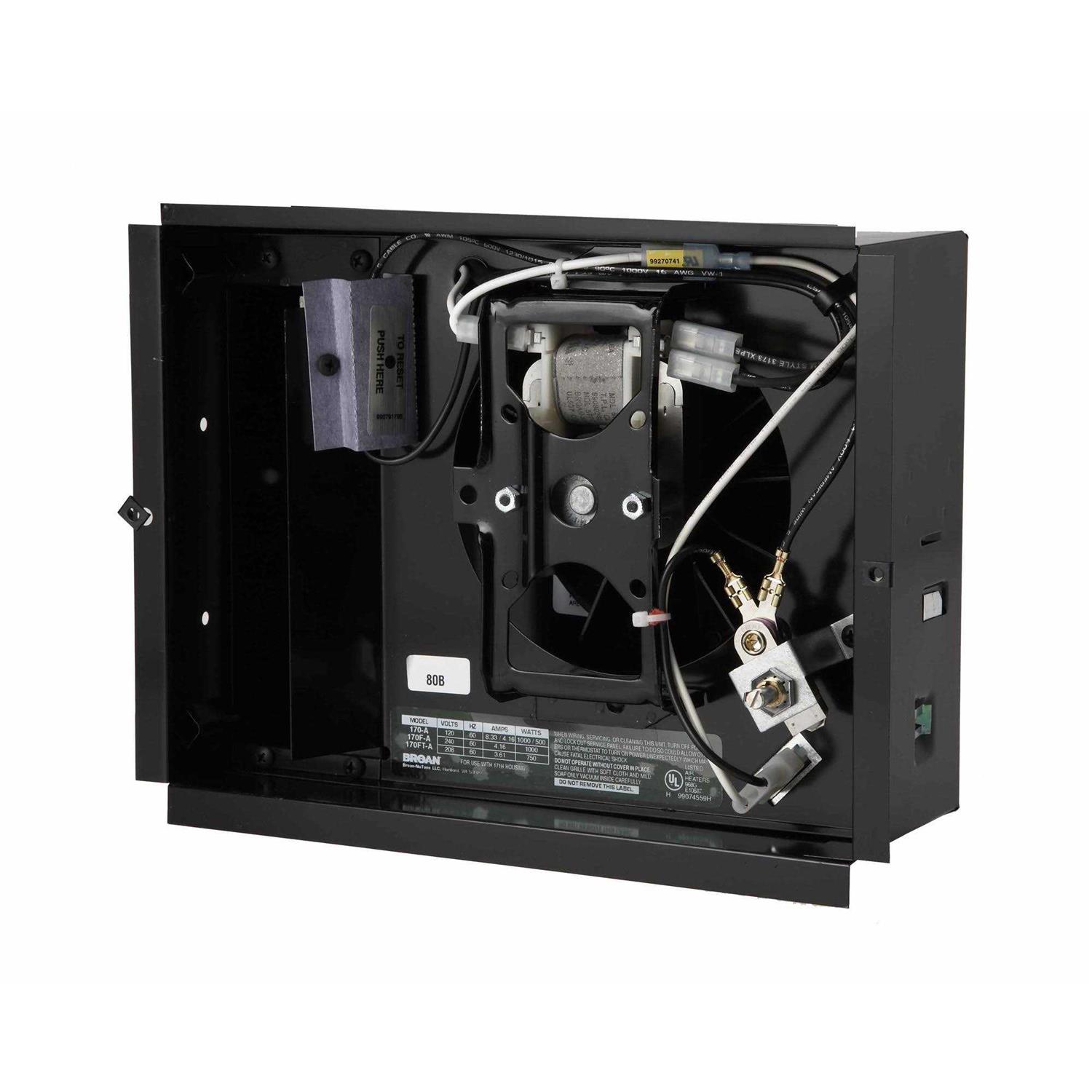 This wall heater is perfect for bathrooms, entryways, or other small areas where you need added warmth on demand. Factory wired at 1,000W, at 120V AC, it can be easily converted to 500W at 120v AC or 1,000W at 240V AC for added versatility. White grille has down flow louvers to direct heat gently toward the floor and a one-piece design with baked enamel finish for durability. Adjustable, front-mounted thermostat offers a simple way to control the level of heat. Rapid warm up time due to an efficient Alloy heating element that provides comforting heat in seconds. Heater may be recessed or surface-mounted, depending on your application (surface mounting requires Model 84 surface mount kit). Permanently lubricated motor, high efficiency blower wheel, Nickel-chrome alloy heating element and a manual reset thermal overload protector combine to ensure reliable operation and years of trouble free heating. UL Listed for safety. Also available in project packs (171H Rough-In Housing Kit, and 170F without thermostat or 170FT with thermostat Finish Kits) for the convenience of contractors working on multi-unit projects. Wall heaters are intended to provide supplemental heat from a wall location and not to take the place of the homes main heat source.