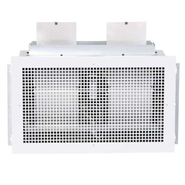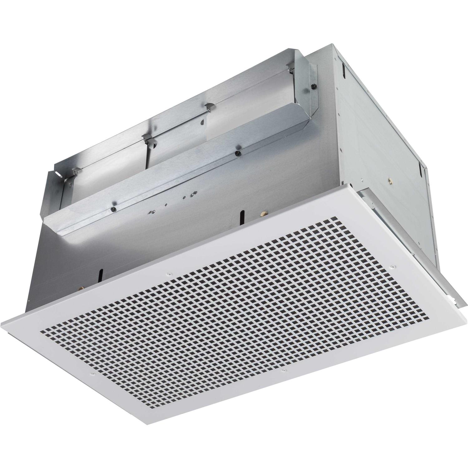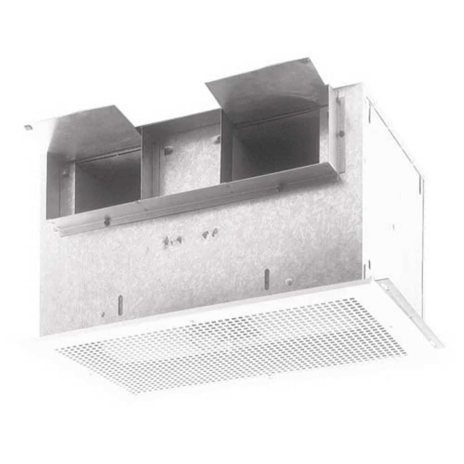 Offering a quiet solution for continuous ventilation needs, this high-capacity, low-vibration fan is ideal for conference rooms, public restrooms, and other commercial building applications. It can be ducted horizontally or vertically, and in-line ducting is available with a separate adapter. Features include a low-profile steel grille, a 4-1/2″ x 18-1/2″ duct connector, a heavy-duty motor, automatic backdraft dampers, and two impact-resistant centrifugal blower wheels. Use an electronic variable speed control, available separately, to adjust blower speed and sound level.