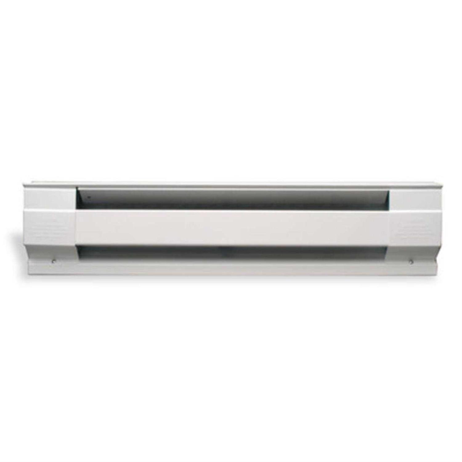 Features: Electric baseboard heater. Easy installation with pre-punched case at 1” intervals. Works best when placed under a window. Oversized high temperature limit switch with full length capillary sensor tube for added safety. 12” Clearance in front and above, 6” to sides. Construction: Rugged steel construction. Color/Finish: Color: White. Powder coated paint for a smooth, durable finish. Specifications: Voltage: 240VAC. Wattage: 1000W. Dimensions: 6.75” H x 48” W x 2.5” D. Warranty: Lifetime warranty.