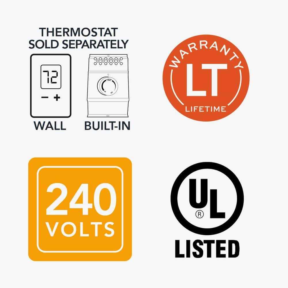 Cadet electric baseboard heaters are a simple and economical way to add quiet, convection heat wherever it’s needed in your home. This white 96-inch heater is an industry-standard size making it ideal for replacement or new construction, and is designed for easy installation with pre-punched mounting marks and wiring at both ends. A thermostat is required for operation (sold separately). Be sure to choose the correct heater size for your room. On the chart below, find the area size you want to heat and then select the corresponding wattage. Proudly made in the USA.