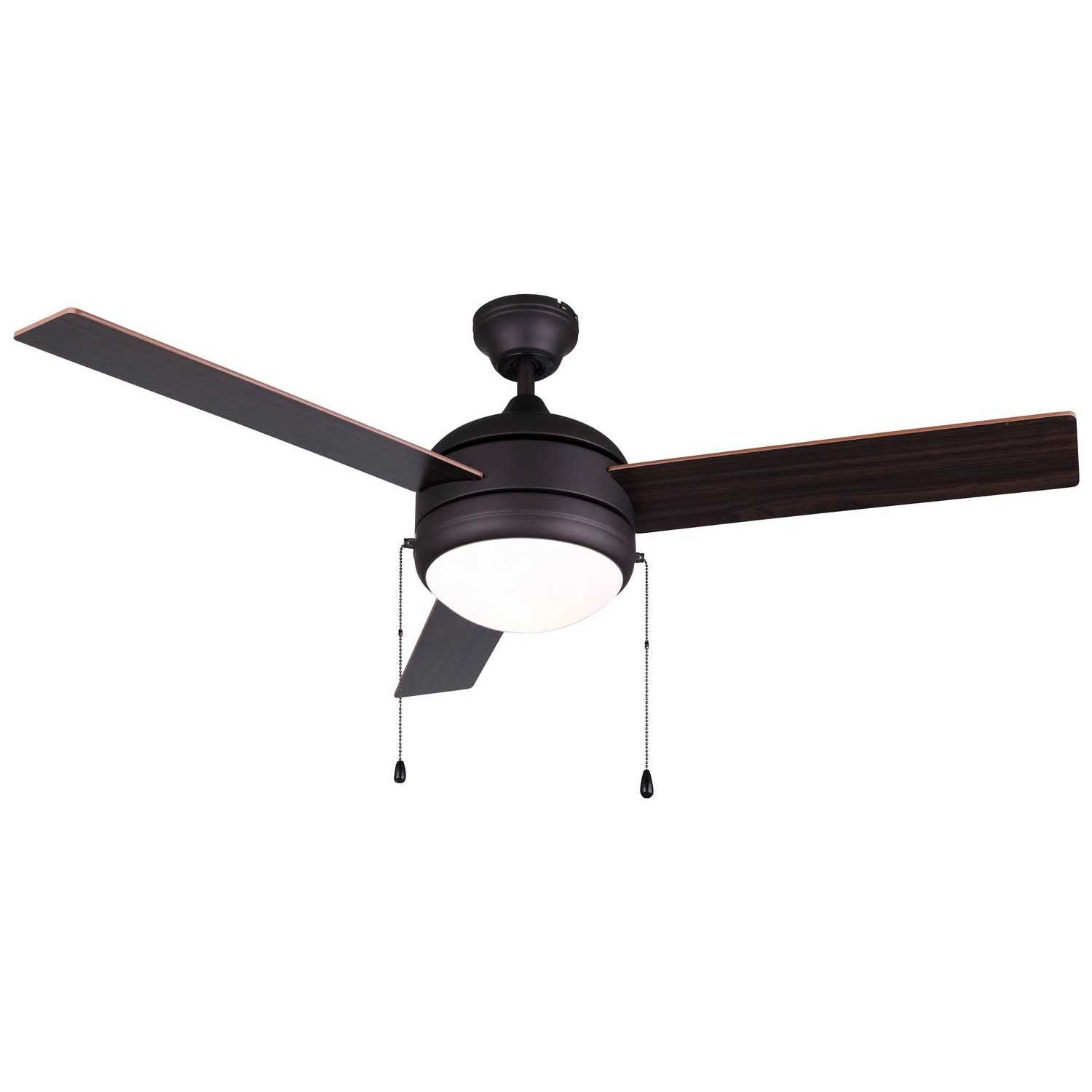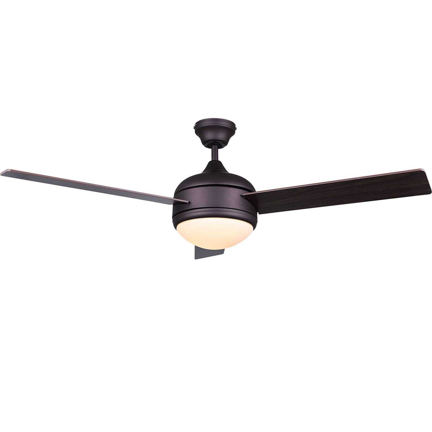 The Canarm 48″ 3 blade ceiling fan is perfectly sized for adequate ventilation in closed room. This ceiling fan sports a bronze and wooden finish, which gives it a refined look and complements your interiors. The ceiling Fan by Canarm includes a light kit and a remote control, and is wall control compatible. It includes a reversible motor, and can be mounted using a downrod. This ceiling fan is made using premium quality materials, which ensure sturdiness and durability. It requires minor assembly, and is safe to be used in dry locations. Wipe it with a clean, dry cloth to keep dirt and dust from settling on it. Features:- Frosted shade. Three speed dual mount with dome light kit and remote control. Airflow: 4632 cubic ft/min. Airflow efficiency: 61 cubic ft/min/watts. Blade pitch: 11 Degree. AMPS: 0.49. RPM (High-Med-Low): 176-128-90. CSA-US listed. Constructed of steel/copper wire/aluminum diecast/zinc diecast. Finish: Dark bronze. 12, 24, 36 downrods available. Motor finish: Bronze. Blade finish: Wood. Distressed: No. Light kit compatible: Yes.