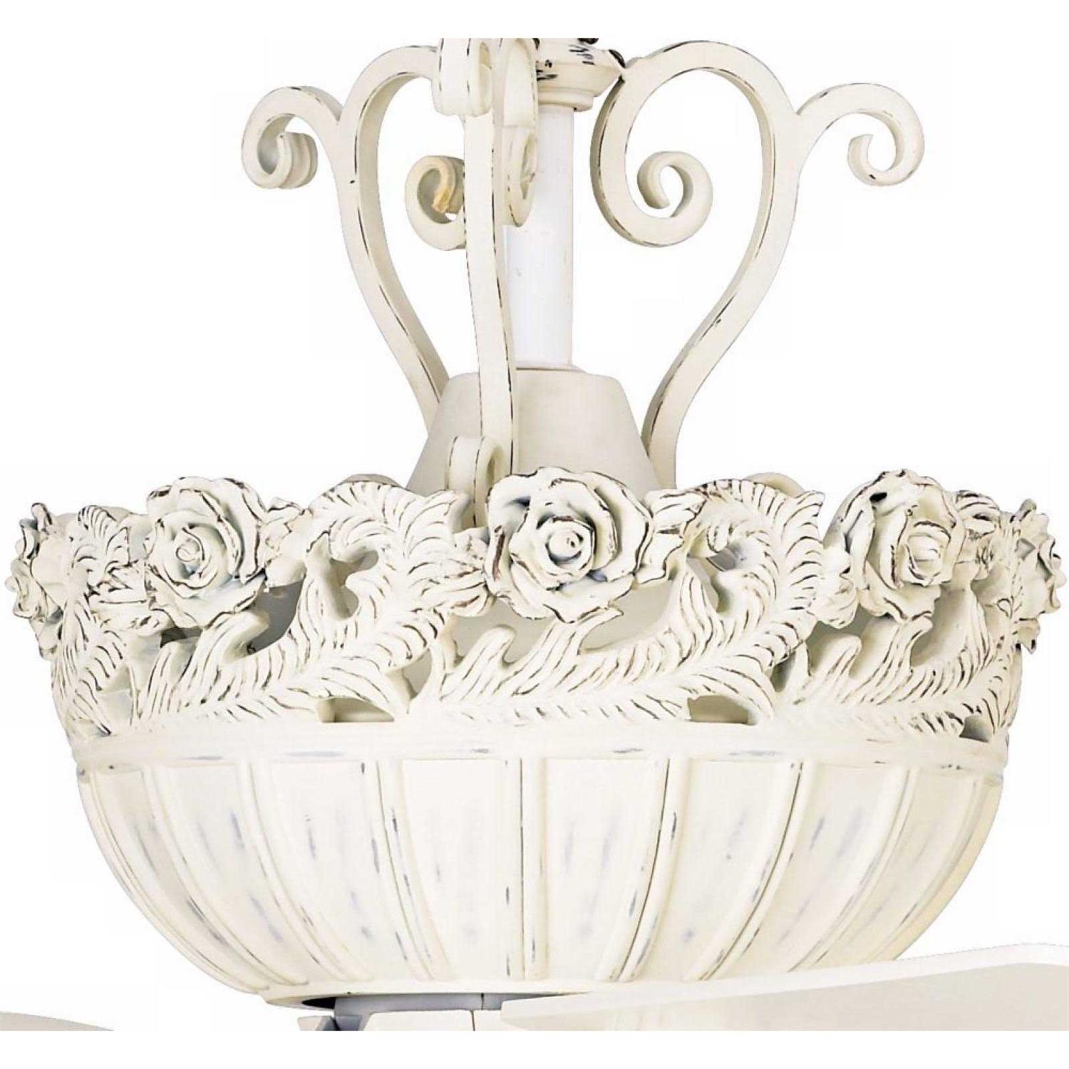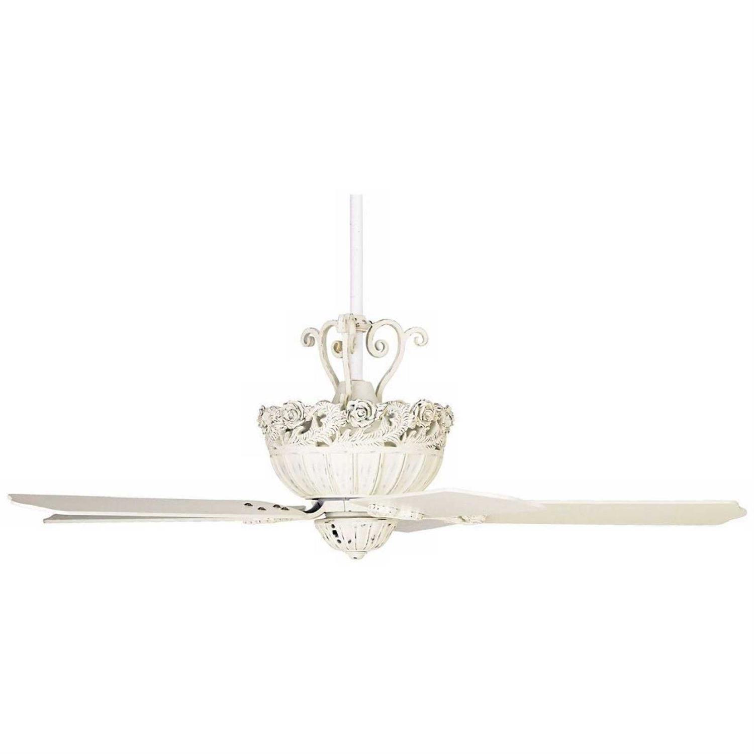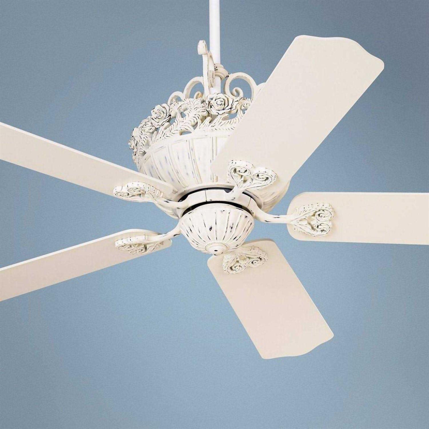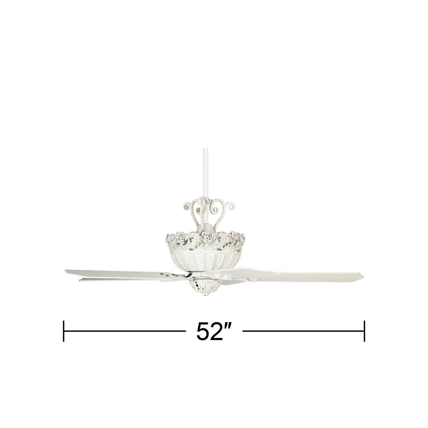 From the Casa Vieja? brand, the Casa Chic? ceiling fan comes in a rubbed white finish with five matching blades, resulting in a beautifully aged look. This elegant traditional ceiling fan design features decorative scrolls that form subtle heart and floral accents. A 10-inch long downrod with decorative scrolls comes included. A minimum 9-foot tall ceiling is required for installation.