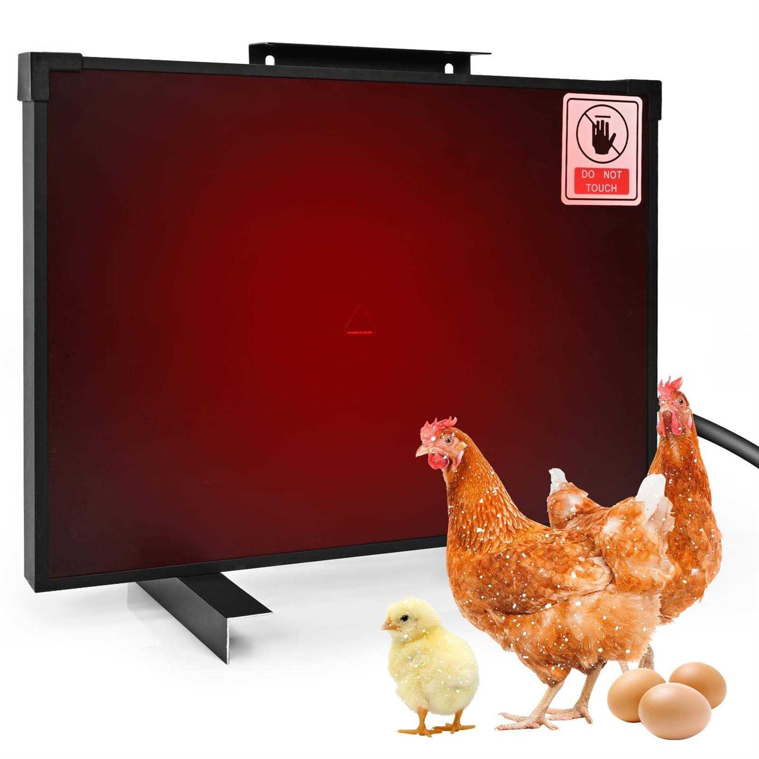 【Safe Heater for Animals】Our Chicken Coop Heater with overheating protection design, heating temperature is between 158°F and 200°F, when the actual temperature is higher than the set temperature, the heater stops working, which can effectively solve the problem of scalding chickens or other small pets, also avoid the safety problem of chicken coop fire caused by overheating. 【Energy Saving】Our chick heating plate adopts energy efficient design, the power consumption is 140 watts which puts out a low amount of heat, much safer than heat lamps and saves a lot on energy costs, ideal for keeping your chickens and young chicks warm in winter or cold weather. 【2 Ways Installations】Chick coop heating panel can be installed in 2 ways, standing on the ground or hanging on the wall via the hole on back, including a long wire to extend your use of the space, all the screws needed are included in the package. 【Widely Used】 Our chicken brooder heater is radiant heat, provide consistent gentle heat without overheating to chickens, dogs, cats or other animals’ habitat. Ideal for outdoor coops and freezing winter temperatures, provide a warm and comfortable area for your chickens. 【Thermally Sensitive Stickers】 A thermally sensitive sticker is stuck on the center of poultry heater panel, which can alert you to the condition of the temperature. When the temperatures below 158°F, the sticker will stay black, and it will turn red when temperatures above 158°F, which can warn chicken that happen to stand near it. Safe Chicken Coop Pet Heater, Keep Your Poultry Warm All Winter! /b br Our chick heating plate adopts energy efficient design to save electricity, with overheating protection design, which can avoid scalding chickens or other small pets, providing comfortable and warm environment to chicken, kitten, puppy and other animals. br br Specifications: /b br Material: plastic br Color: black br Size: 15.7″ x 11.8 ” x 1.3″ br Input voltage: AC 110 to120 V br Output power:140W±10% Power at 110V AC, 167W±10% Power at 120V AC br Maximum temperature: 200°F br br Package includes: /b br 1 x Chicken coop heater br br Why choose our chicken coop heater? /b br Chicken heater built-in integral heating module design, keep your chickens happy and cozy through the cold season. br Chicken heater for coop is equipped with an adaptive variable temperature system. The highest working temperature can reach 200°F. The temperature will drop from 200°F to 158°F after reaching the highest temperature, then goes back to 200°F. br The type of heat is radiant heat, it’s very safe for your chickens. br The built-in temperature control chip in the chicken heater controls the heating mode of the heating module to save power consumption. br With overheating protection design, effectively solve the problem of overheating and scalding chickens or other small pets, and also avoid the safety problem of chicken coop fire caused by overheating. br The heating panel not only work perfectly for the chicken coop, but also applicable to other scenes, such as dog house and indoor use. br The color on the thermal sticker will change to remind you of temperature conditions.