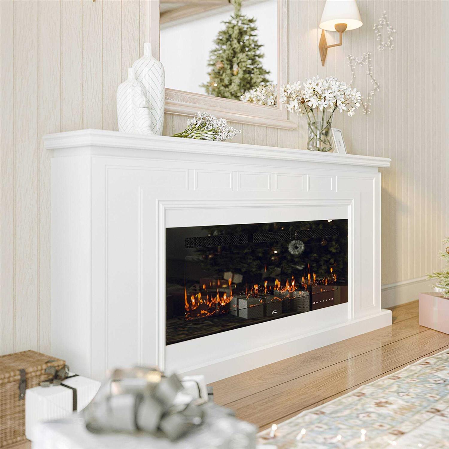 This recessed fireplace comes with logs and crystals that resemble burning coals, creating an authentic feel & look of a traditional fireplace. add comfort and cozy to your living room layout or restful retreat with this electric fireplace, featuring an insert with adjustable flames that can heat up to 400 square feet. 12 flame colors available and 5 flame color intensities, you can change the flame color from dimmer to brighter, and it’s easy to set an optional 1-hour to 8-hour shut-off timer with the front panel. After heating, 750W & 1500W modes can be adjusted accordingly for both warm and energy saving purpose. This fireplace is ideal for a family room, bedroom, hotel lobby, or anywhere supplemental heat and ambiance are needed.