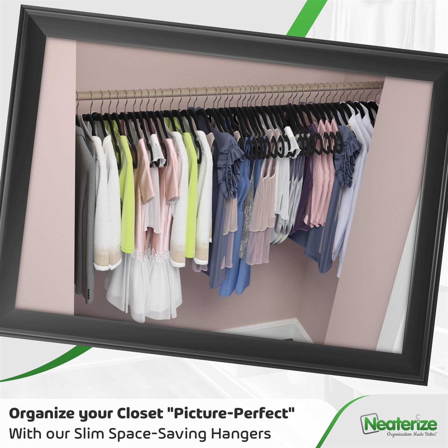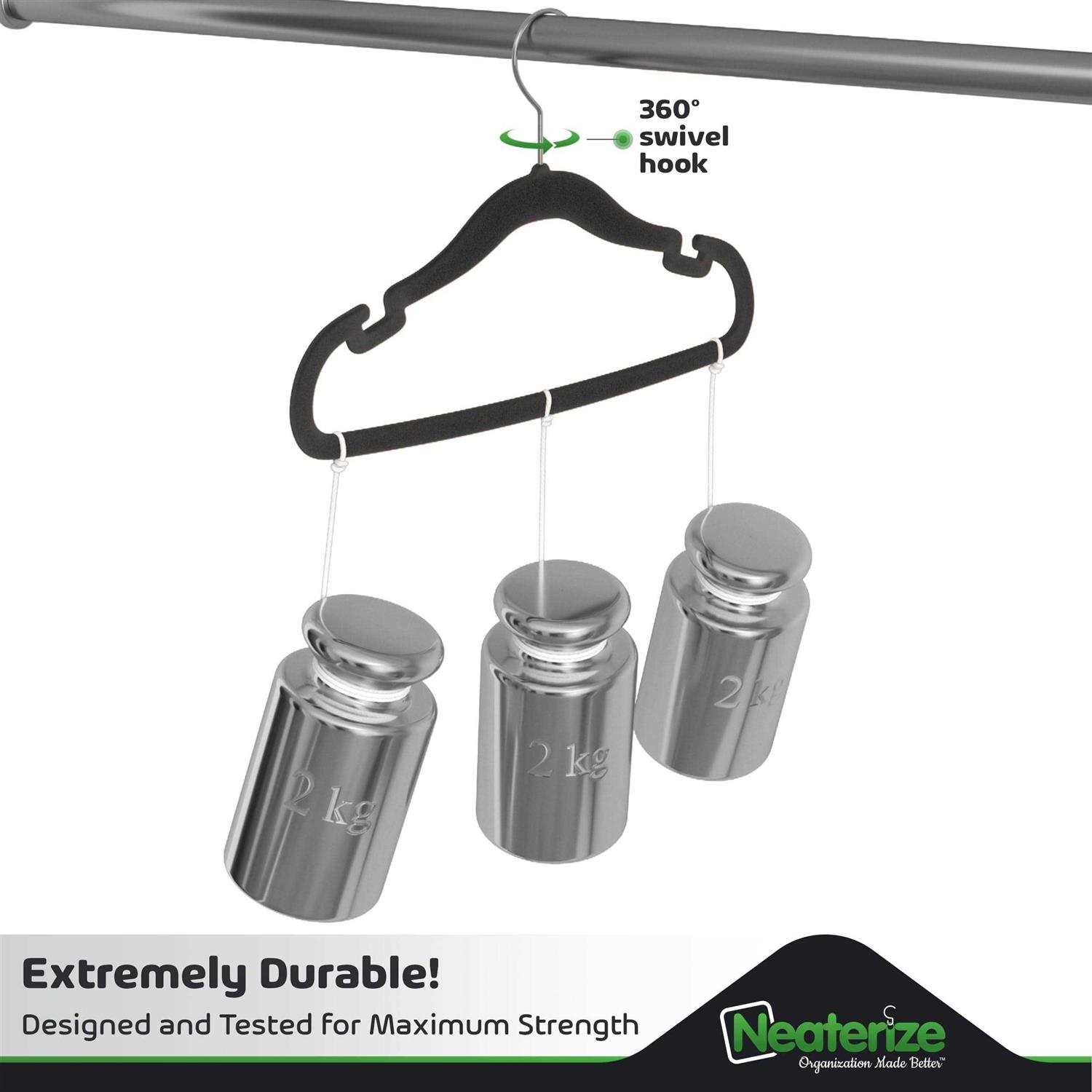 CHOOSE, USE & RE-USE! Slim, sleek & space saving, our baby hangers take up minimal space, maximizing storing capacity. Thin appearance notwithstanding, don’t be afraid to pile it on! These baby hangers for closets measure at 11.6″x 7.9″x 0.2″ and they hang it all! The ultimate baby wardrobe organizers; sorting all those baby shirts, coats, sweaters, dresses, pants, & outerwear while accessories stay in their in place on convenient hooks that don’t leave any marks! QUALITY THAT STAYS HANGING! Our company’s priority? Performance! Keep those kids hangers up & running! Heavy-duty plastic & a sturdy metal hook means lasting and long-term closet fixtures, intended to hold bulky winterwear. Featuring swivel hanger hooks that offer flexibility & reduce breakage, this is the one kids hanger in your baby’s closet that won’t crack under pressure! CHIC CLOSET COMPANIONS! Practical, productive & full of pizzazz! The Neaterize velvet childrens cloth hangers do more than store your little one’s clothes, they utterly transform your storage space from functional to fabulous, mundane to magazine worthy. Alter any room or nursery with these trendy, coordinating non slip velvet kids hangers, making your closet the celebrity of home décor! THE HANGER HAS IT’S HEYDAY! Time to celebrate the long-awaited innovation of the classic baby hanger! Cheers to Neaterize for debuting the modern take on what is the universally conventional kids hanger design! Instead of the customary notches that can pull, tear & restrain access, this Felt baby hanger is exclusively designed with two custom hooks. The Neaterize velvet baby / Infnat hanger has no match or mimic on the market! Ganchos De Ropa Para Bebe