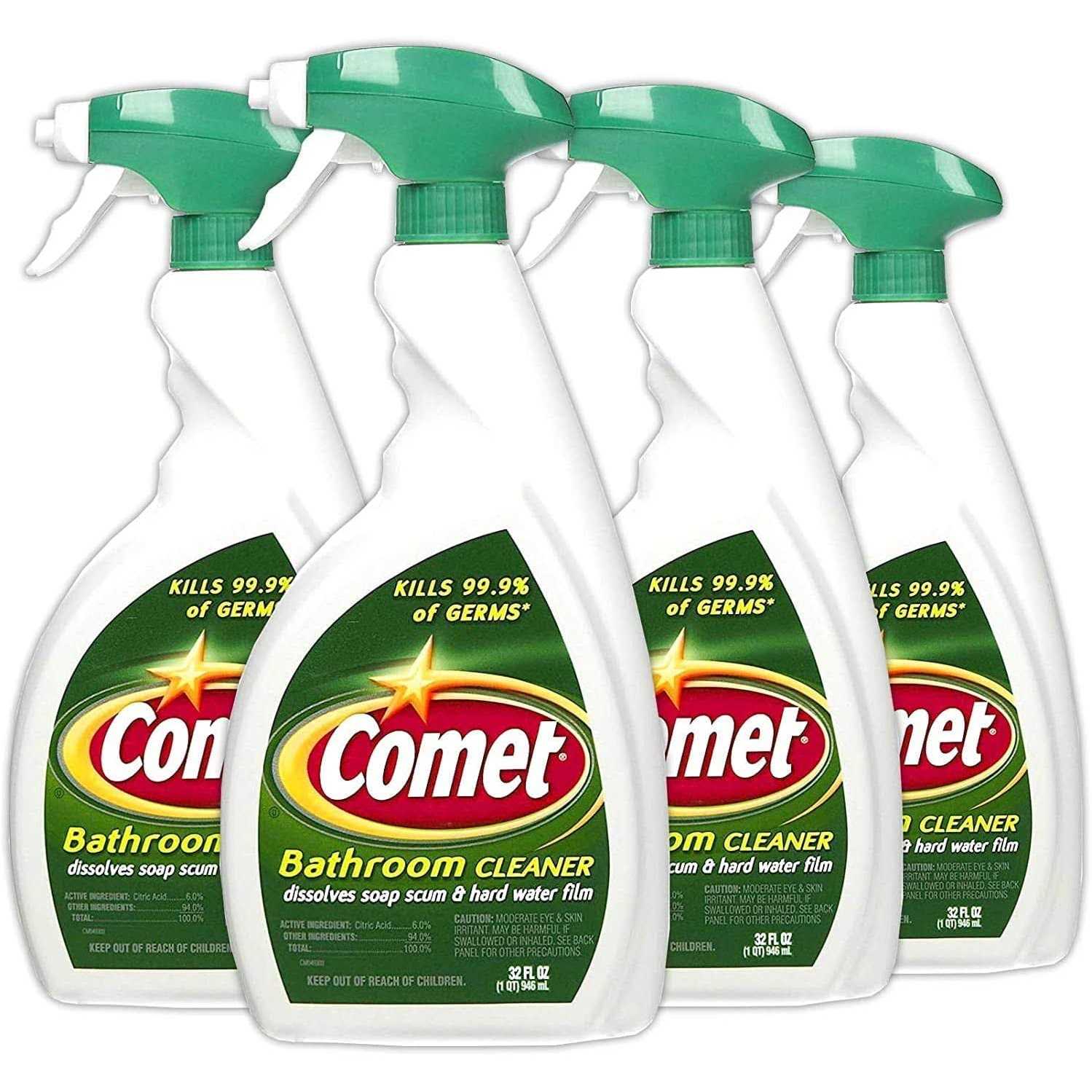 Comet Ultra Bathroom Cleaner Disinfects and cleans tough stains. It’s great on surfaces such as sealed fiberglass, glazed porcelain, stainless steel, chrome, synthetic marble, Formica, plastic and vinyl. For old or worn surfaces, test on a small area before use. Do not use natural marble, stone, brass or colored grout. Comet Bathroom Cleaner kills most household germs including Staphylococcus aureus, Salmonella enterica, Pseudomonas aeruginosa and Escherichia coli.