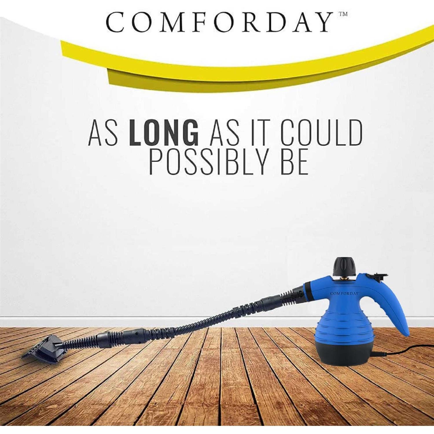 Nine free accessories: Tools adapt cleaner to every situation, including stairs, carpet, clothing, car interior and rims, etc. Gets into hard to reach areas. Multi-surface use: Works on every surface including laminate, hardwood, fabric, upholstery, wall paper, car, window, ceramic, linoleum, glass, marble and granite. Chemical free and safe: The Comforday steamer is completely nature and secured with a safety lock and safety cap. Powerful hot steam: Heat and pressure gets the job done faster. QUICKSTEAM technology offers 1050W of power; providing pressurized powerful hot steam (250-270F) for up to 15-20 minutes. Cuts through dirt: Tackle the biggest messes such as grout, grease and stains easily and quickly.