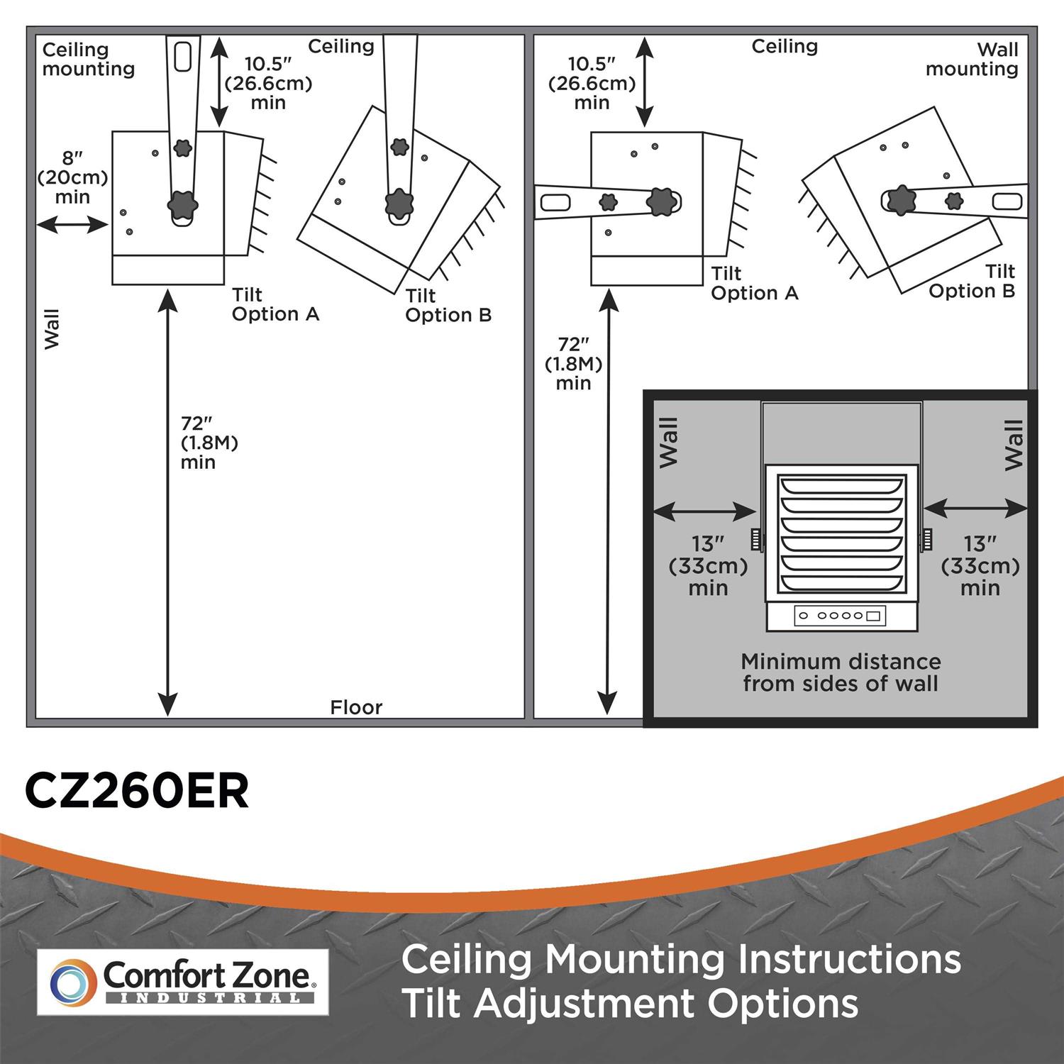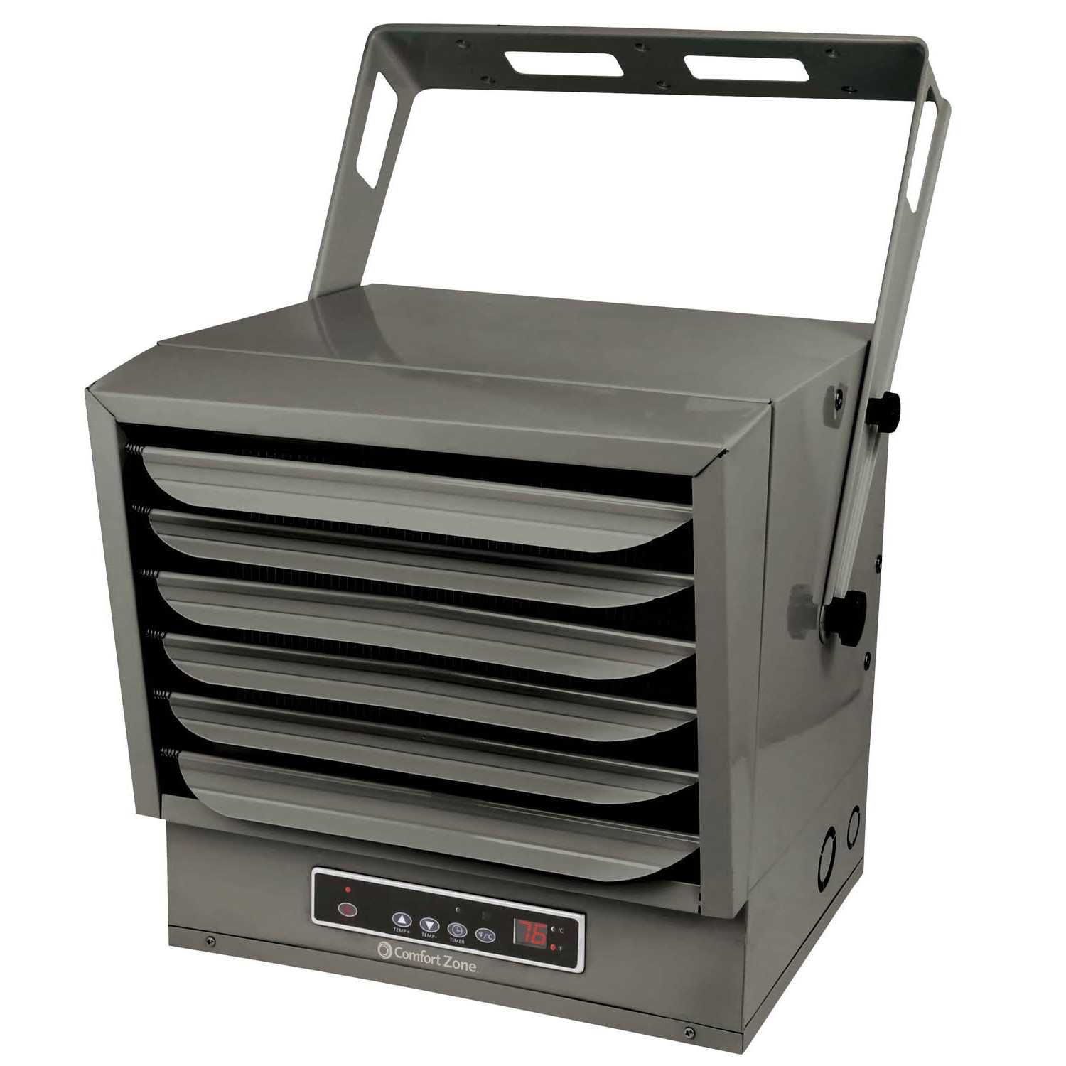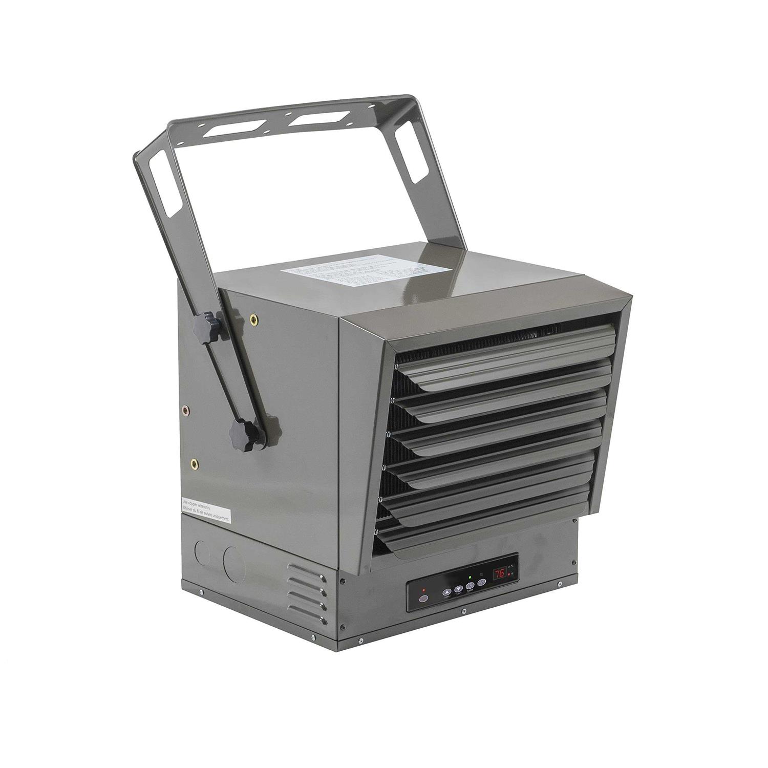 The Ceiling Mount Industrial Heater by Comfort Zone is a heavy duty heater with 2 powerful heat levels, up to 10,000 watts. This digital heater features an easy to read LED display that shows current and set temperatures with a digital thermostat that can be easily controlled with a remote (battery’s not included). It has a fully enclosed motor, a 12 hour timer, and fan-forced heat that provides wide air circulation. The adjustable louvers, along with the variable mounting brackets are convenient for directing the airflow at the desired angle. Its removable front grille assembly allows for easy cleaning. The housing is constructed out of heavy gauged steel. This industrial heater also features a fully enclosed motor for use in dusty environments. All heating elements are fully sheathed for maximum durability. Once the heater is turned off the fan shut-off delay will cool down the heater for 60 seconds. The advanced safety system includes and overheat protection system and an electronic temperature limiter for dual-protection. Conforms to all OSHA and NEC standards. Reliable 208-240V 60Hz 1-Phase hardwired connection.