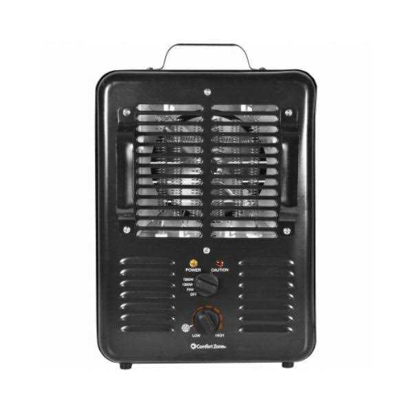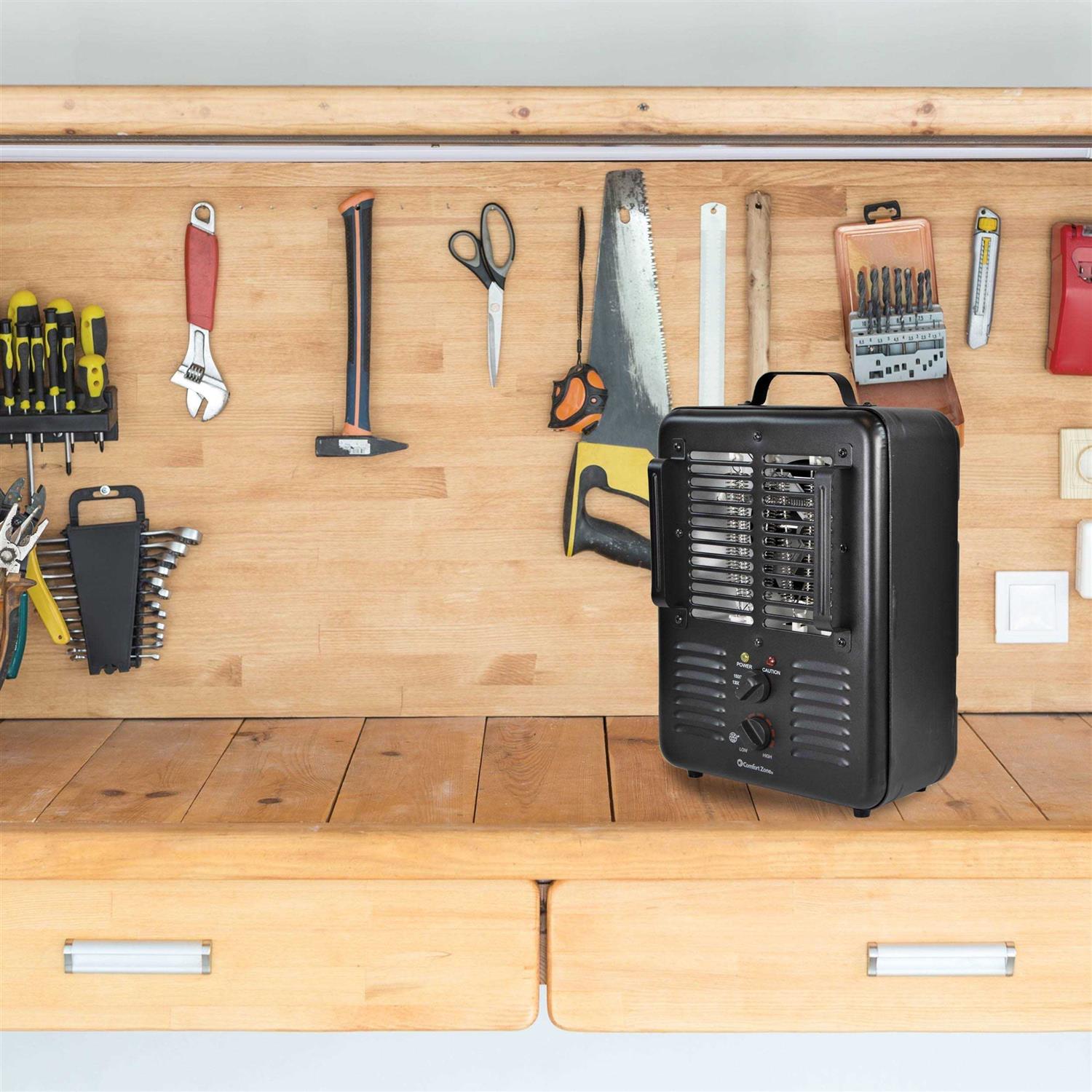 The Comfort Zone Milkhouse Utility Heater can quickly and easily warm up your garage, workshop or other enclosed space. This energy-efficient, compact design can help save you money on your heating bills by providing targeted heating performance where you need it. Its durable all-metal construction makes this compact utility heater a functional and practical addition to any work space. 2 powerful heat settings and a fan-only setting for cooling provide maximum flexibility. The easy-to-use adjustable thermostat makes it easy to find the perfect temperature for your space. The power and caution indicator lights let you know when the heater is operating and when there is cause for concern. The safety overheat protection sensor prevents the heater from getting too hot. The safety tip-over switch instantly cuts power if the heater is accidentally knocked over. The stay-cool metal housing protects users from burns and features an over-sized carry handle for safe and comfortable transport. 2 heat settings, plus fan-only setting Adjustable thermostat Durable metal frame and sturdy carry handle for lasting use Safety tip-over switch, stay-cool body and overheat protection sensor Uses 1500/1300 Watts Model Number: CZ799BK. Age Group: adult.