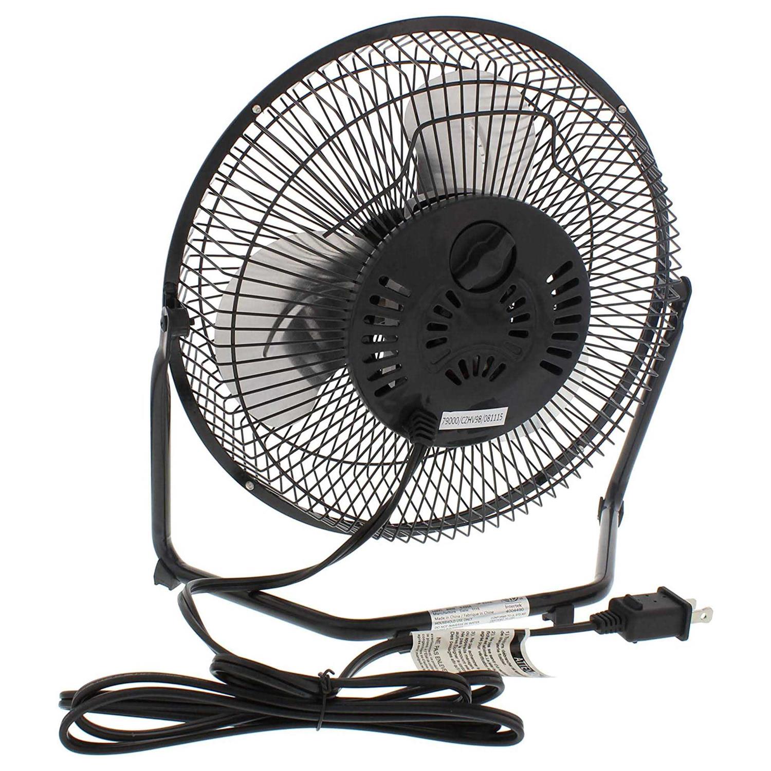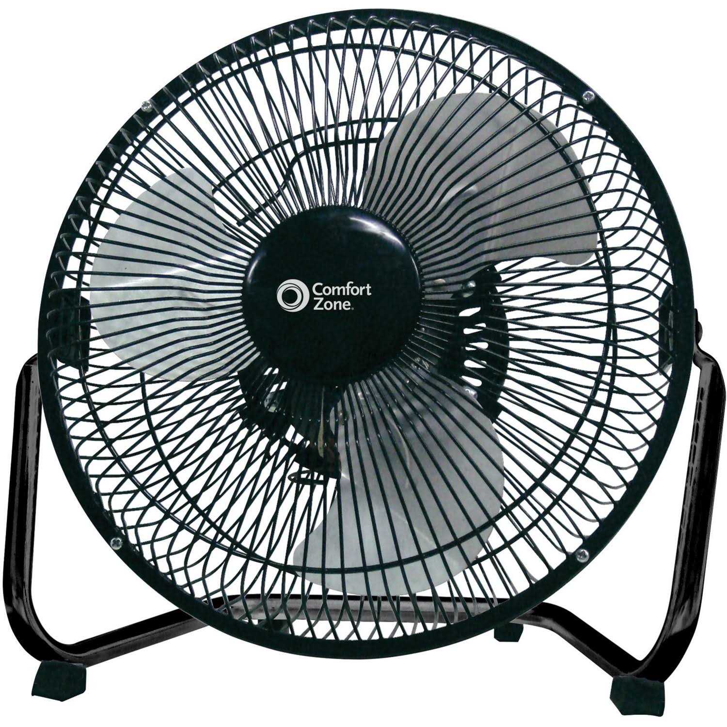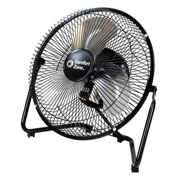 The small size and powerful output of this 3-speed floor fan from Comfort Zone make it a compact and convenient industrial fan for garage, warehouse or gym use. The 9 inch cradle design sits conveniently on the floor, where you can choose from three speed settings to modify the velocity of air output to suit your space in any season. An adjustable 180-degree vertical tilt function makes it easy to enjoy targeted cooling with this high-velocity fan. Simply reposition the fan head to direct powerful airflow wherever it is needed in the room. All-metal construction ensures these floor fans are built to last, and the rubber feet provide added stability that helps to minimize vibration. A metal safety grill protects hands and other objects from moving blades while the fan is in use, and a convenient carry handle lets you comfortably transport this 3-speed industrial fan from room to room.