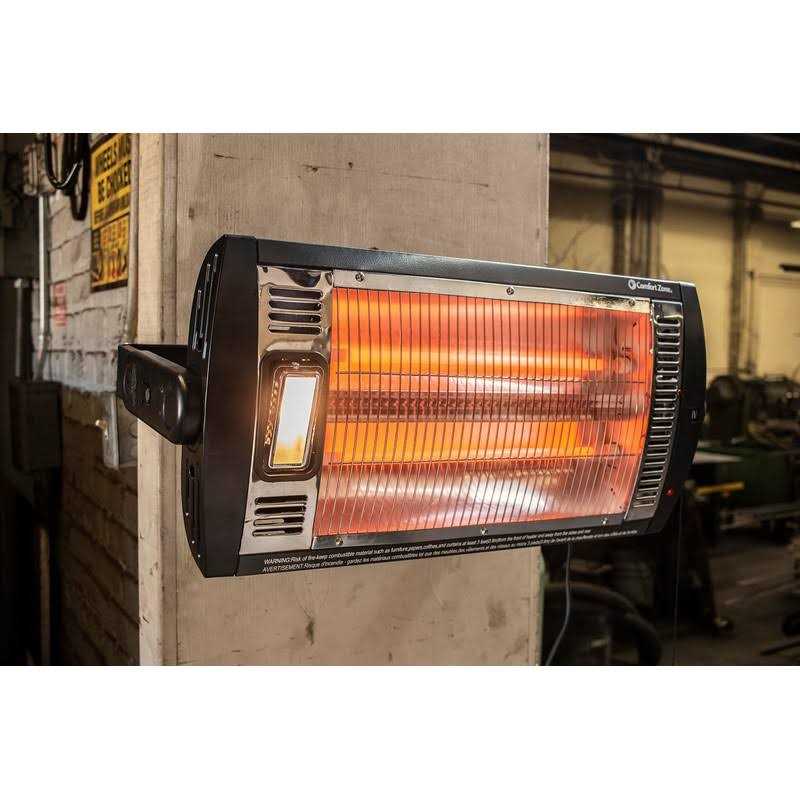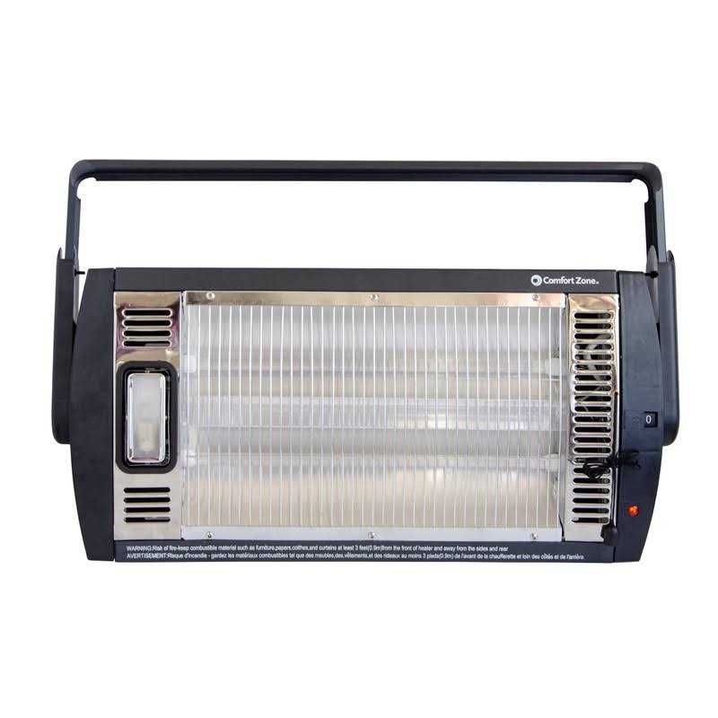 Powerful Radiant Quartz Heater Ideal for use in garages, workshops and drafty living areas, this Comfort Zone quartz heater offers plenty of power. The heater’s two quartz bulbs reflect heat onto nearby objects just like the sun, warming the area in front of the heater gently and efficiently. Space-Saving Design The radiant heater is ceiling mounted, which helps to conserve valuable floor space in a crowded garage or storage room. The heater is easily angled up to 90 degrees, which helps to ensure that the output is directed to just the right areas.Convenient Built-in Halogen Light A bright halogen light has been built into the heater to allow you to view your projects more clearly and read fine print on packaging while you’re working in dimmer areas. Simply pull the cord to turn it on and off. The Type G9 25 Watt halogen bulb for the light is included to allow you to get it up and running without an extra shopping trip.Advanced Safety Features The quartz heater boasts a tough metal safety grill over the bulbs to help prevent them from breaking or coming into contact with flammable items. A built-in sensor shuts the unit off immediately when it reaches an unsafe temperature, helping to prevent damage due to overheating.