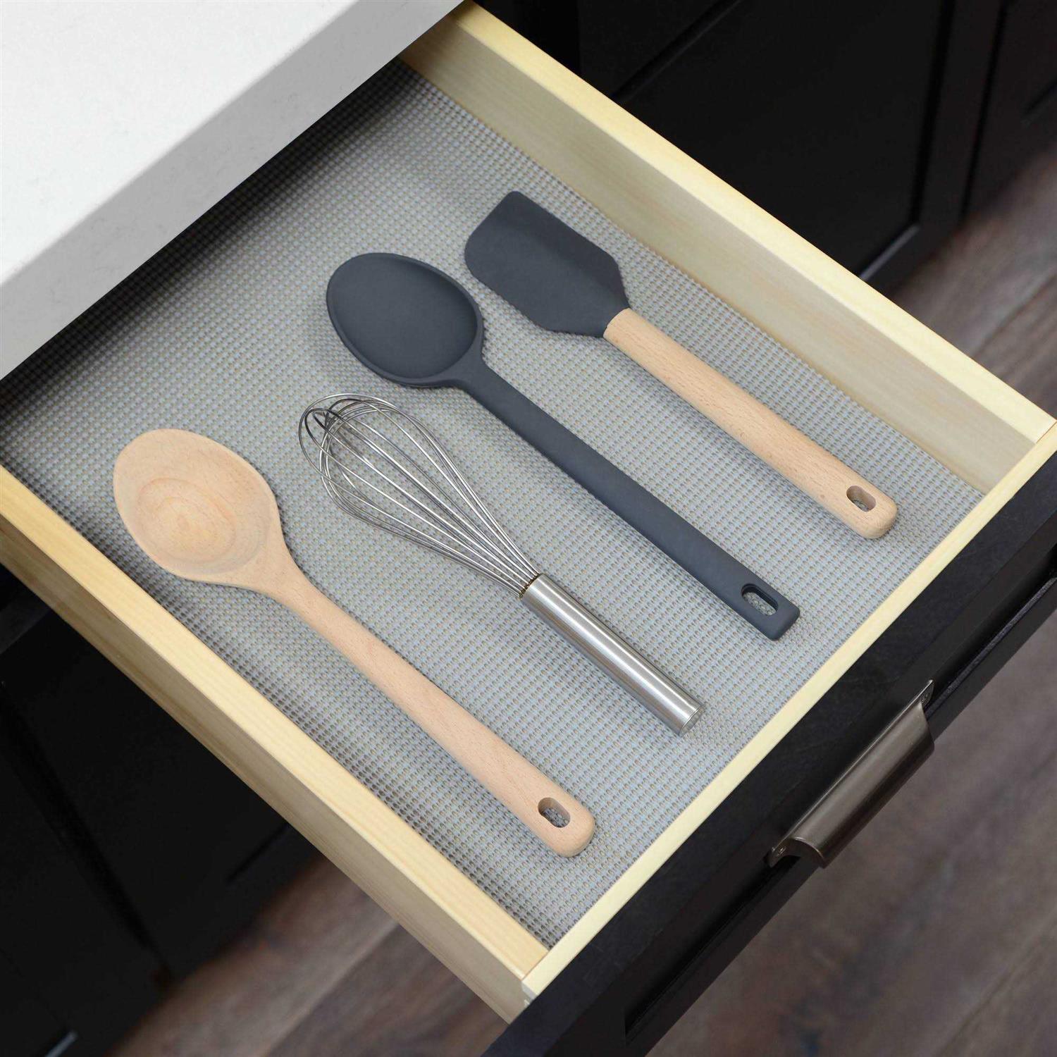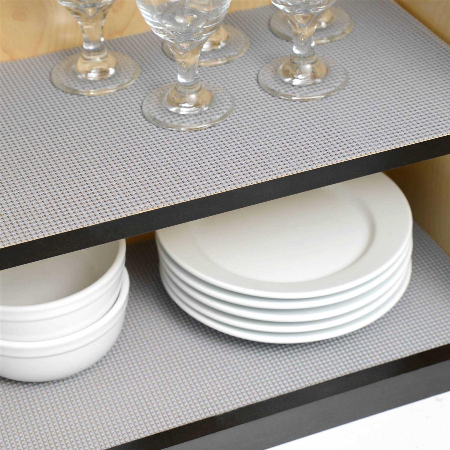 Medium Cushion Con-Tact Grip shelf liner. Non-slip on both the top and bottom of the liner. Washable and durable. Cushions and protects most surfaces. Easily cuts straight by following the gaps between the beads. Available in Alloy Gray. Pattern: Solid. Size 12″x10′.