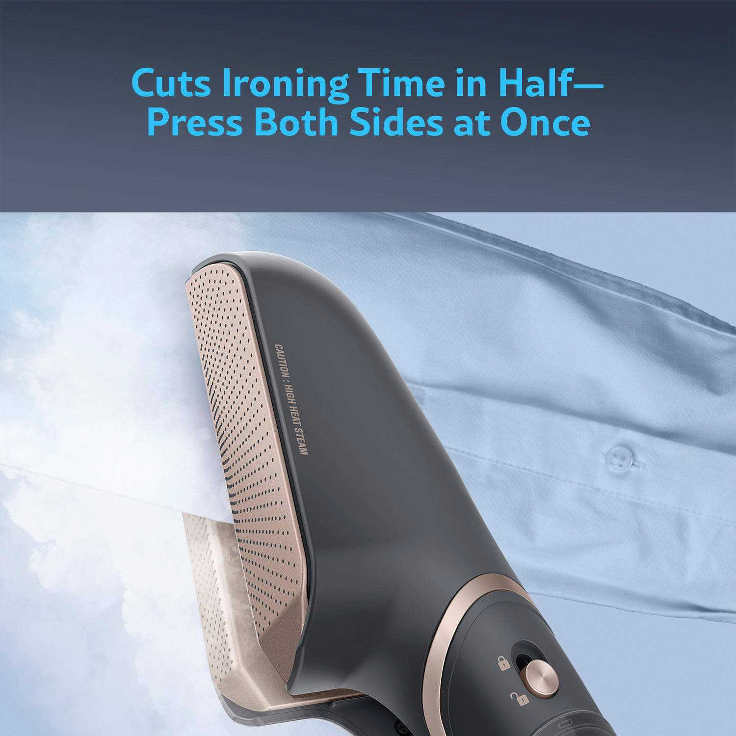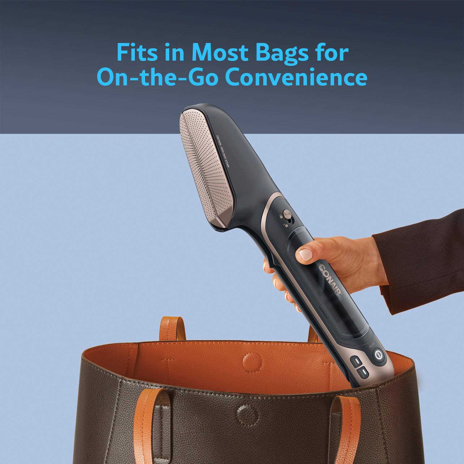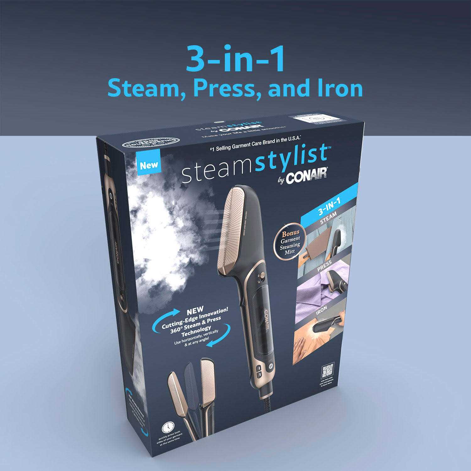 Steam, press, and iron—all in one! Designed for complete 3-in-1 ease and convenience, the innovative SteamStylist by Conair takes the wrinkles out of clothes and the stress out of garment care with cutting-edge 360° Steam & Press Technology. Use it horizontally, vertically and at any angle for ultra-smooth, versatile styling that leaves clothes looking fresh and perfectly pressed.Heated ceramic-coated aluminum plates press and iron any garment to perfection with an easy glide. The aluminum plates lock and unlock at the touch of a button, so you can switch seamlessly from ironing to steaming to pressing. The normal steam setting is ideal for most garments, and the turbo setting provides supercharged steam to smooth away even the most stubborn wrinkles. The unique shape of the plates reaches hard-to-reach areas with smooth precision. Save time by pressing both sides of a garment at the same time with the heated inside plates. Enjoy dry cleaner-caliber creasing, pressing, and ironing made easy. With a sleek, stylish profile, it fits easily in most bags for on-the-go convenience.Equipped with sophisticated technology yet easy to use, the SteamStylist by Conair makes your life a little smoother by removing the wrinkles from your garments at home, the office or anywhere. Keep clothes looking like new without the hassle or cost of having to visit the dry cleaner. The removable water reservoir is easy to refill and the 8 ft. cord makes it easy to reach anywhere on a fabric. Powerful and lightweight, with normal and turbo steam settings and 3-in-1 versatility, this is the only garment care tool you need to keep your clothes perfectly wrinkle-free and fresh-pressed for years to come.