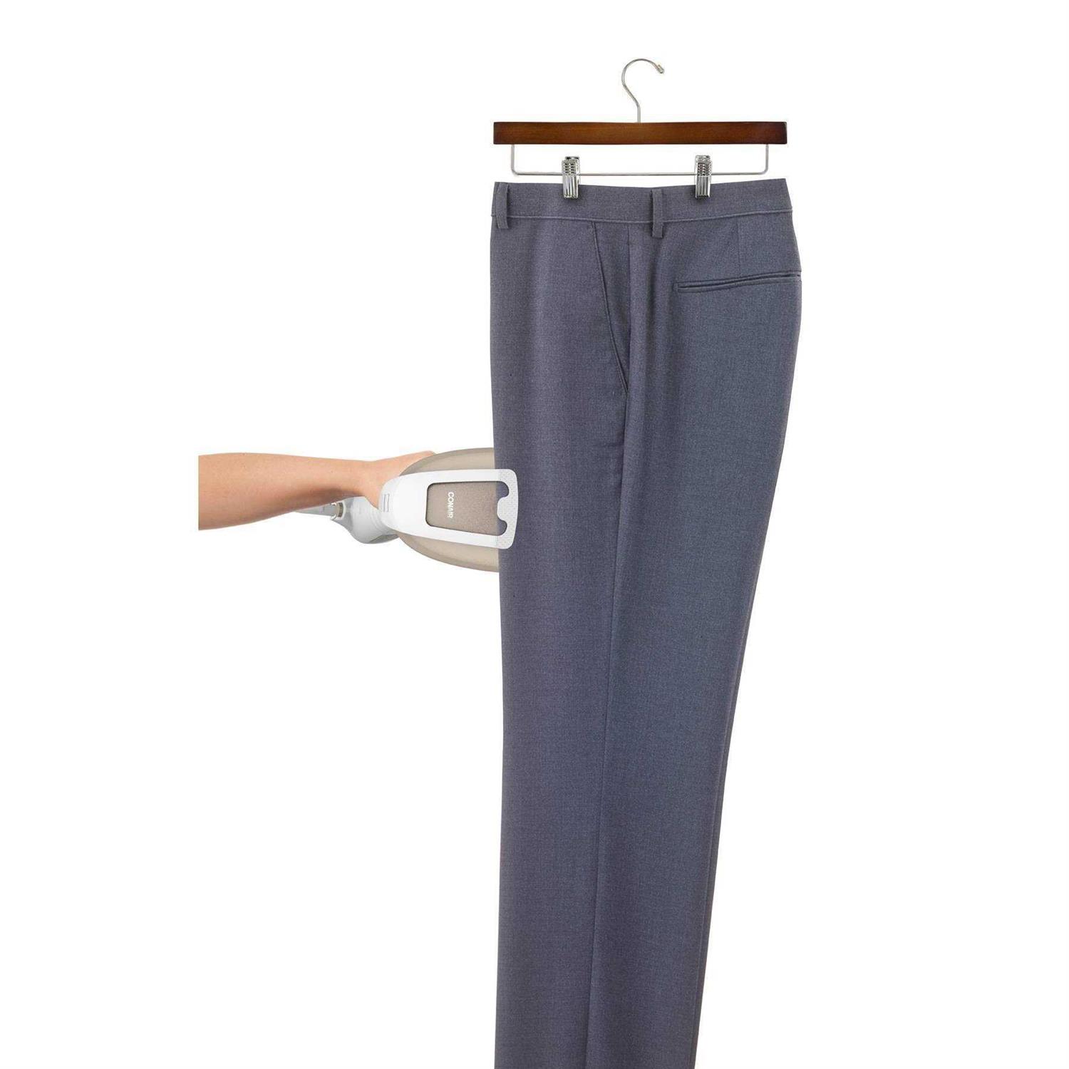 Eliminate wrinkles at home or on the go! Its heated dual-slotted ceramic-coated aluminum sole plate lets you use it as a steamer AND an iron. It heats up in just 40 seconds and gives you up to 20 minutes of steam. Has 5 steam settings from delicate to turbo. Includes built-in creaser, bristle brush, delicate fabric spacer and silicone band attachment (keeps fabric taut). 9′ cord. 6 1/2 w x 12 h x 5 d. | Conair Turbo Extreme Steam, White