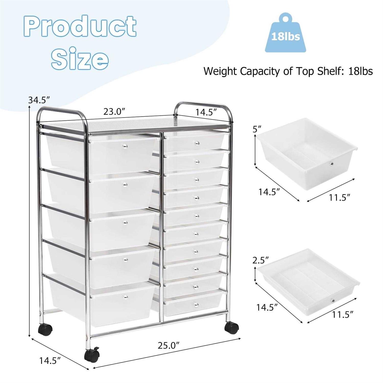 Costway 15 Drawers Rolling Storage Cart Organizer Our 15 Drawer Rolling Cart is a good organizer to neatly organizes you work and life stuff for the home, classroom or art studio. Constructed with industrial-strength tubular steel finished in chrome, it is rust-resistant and can be used for long time . Feature 5 big drawers and 10 small drawers, this Cart perfect for classifying and preserving paper, tools, accessories, crafting or scrap booking. Ample space for storage and classification 5 big drawers and 10 small drawers for storage The drawers slide unattached through metal channels Four universal casters, freely move to any place 2 lockable casters easy to keep it in place Steel frame and rails are designed to hold up to 120lbs A great organizer to tidy your personal space. Clear boxes ,easy to find the item Large steel cart top provide abundant space to place the display Anti-rust and durable Perfect for store makeup and cosmetics, storing arts and crafts supplies, and arranging tools Tidy your living space, home, office, garage or school, Easy to assemble