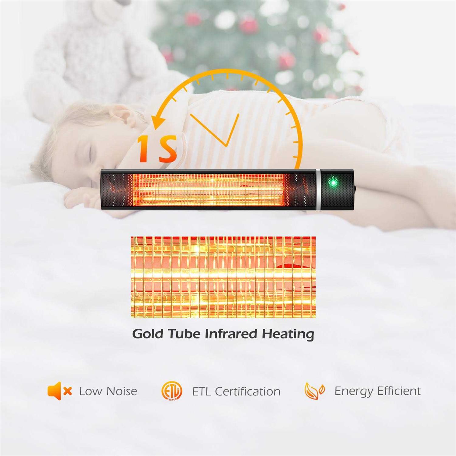 Adjustable heating modes (750W/1500W) and 9 heat range for ideal temperature 0-45 degree tilted mounting angle for better warm enjoyment 24h time setting with auto shut-off setting for cozy sleep Features This wall mounted electric heater provides you a warm place in winter. With advanced infrared heating system, our space heater can heat up your room in 1 second. And the remote control allows you to set an ideal temperature easily. Besides, you can change the tilted angle of this heater to set a great radiation direction and its quiet operation offers you a better environment for relax and work. 24h timer with auto shut-off can save your bill effectively. What’s more, high quality heater with wall-mounted design ensures the safe using experience and much more useful space. Material: Aluminum Alloy Overall Dimension: 21” x 4” x 4” (LXWXH) Net Weight: 3.5 lbs Maximum Energy Power: 1500W Rated Voltage: AC120V, 60Hz Power Cord Length: 6.2” Package Includes: 1 x Infrared Space Heater, 1 x User Manual, 1 x Screw Bag