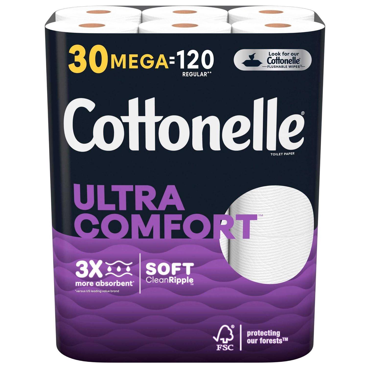 Cottonelle Ultra ComfortCare Strong Toilet Paper – 30 Mega RollsAbout this item Soft, quality 2-ply toilet paper is septic-safe and 3x more absorbent. Use with Cottonelle flushable wet wipes for a shower fresh clean. Cleans gently, removes moisture and is safe for sensitive skin. Cottonelle is FSC certified. DescriptionGet the superior performance and softness youve been waiting for with Cottonelle Ultra Comfort Toilet Paper, designed to leave you comfortably dry. The extra soft cleaning ripples are safe for sensitive skin and cleans gently while removing more moisture. Premium, soft 2-ply toilet paper, Cottonelle Ultra Comfort toilet tissue is 3x more absorbent than the leading value brand in order protect your hands and bottom as you cleanup. Cottonelle is septic-safe and clog-free. Each Mega Roll has 268 sheets per roll so you can worry less about running out when you or guests at your home need it most. Looking for more ways to feel clean down there after taking care of business? Use Cottonelle flushable wet wipes to feel shower fresh 3x longer. Cottonelle cares about you and our planet.