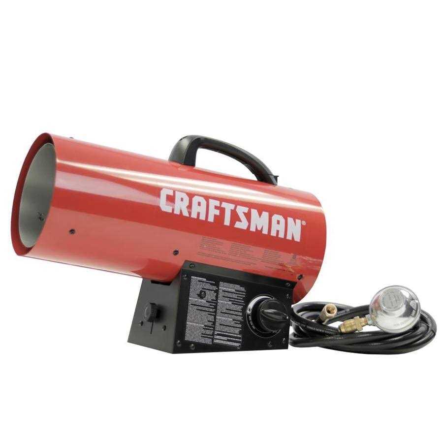 Whether you are using in a garage, workshop, on the job site, or on the farm, the Craftsman 60,000 BTU portable forced air propane heater is the perfect heating solution. Variable heat output from 30,000 to 60,000 BTUs heats up to 1,500 square feet with an adjustable heat angle allowing for greater control. Includes a 10 ft. hose and regulator with an approximate 14 hour run time on a 20 lb. propane tank, for comfortable warmth day or night. Designed with continuous electronic ignition for quick and reliable starting, and equipped with an overheat detection system and thermo-electric safety valve that shuts off gas flow if the flame goes out, you can focus on the task at hand with no worries.