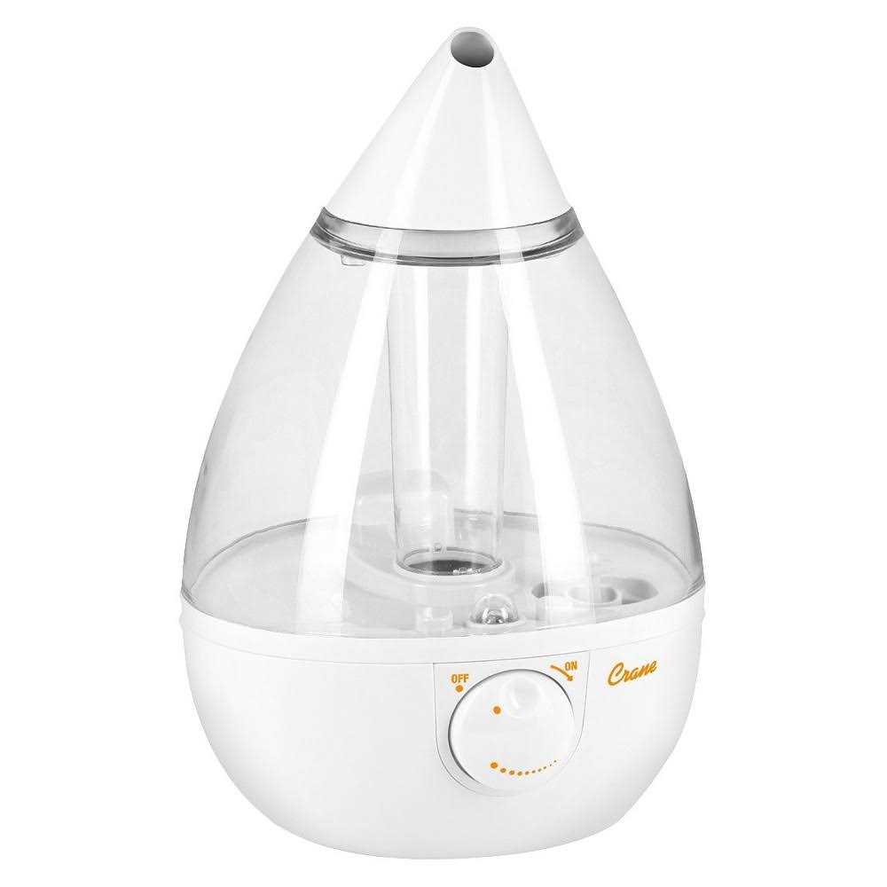 The modern, simplistic design of the Crane Drop Shape Cool Mist Humidifier makes it a tasteful addition to any room in your home. A finalist in the 2011 International Housewares Design Awards, the Crane Drop Shape Cool Mist Humidifier provides up to 24 hours of moisture on medium setting. Suitable for rooms up to 250 square feet in size, this compact unit is energy-efficient and uses ultrasonic technology to add soothing moisture to dry air. Available in an array of stylish colors, the Drop Humidifier is an ideal combination of form and function and makes a great gift for any occasion. This humidifier does not require a filter to operate. The Crane Drop Shape Cool Mist Humidifier runs up to 24 hours and puts out up to 1 gallon of moisture. A 360-degree nozzle lets you direct the cool mist, while a variable output control located on the front of the unit makes for easy operation. Color: Clear & White.