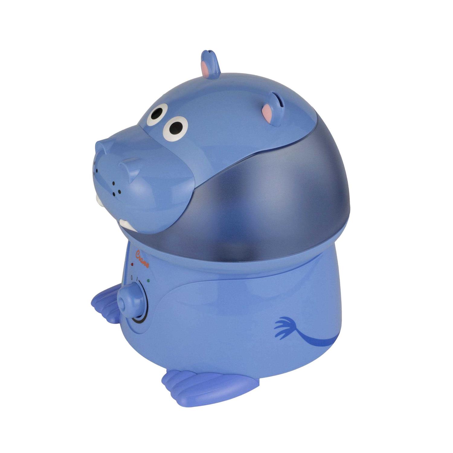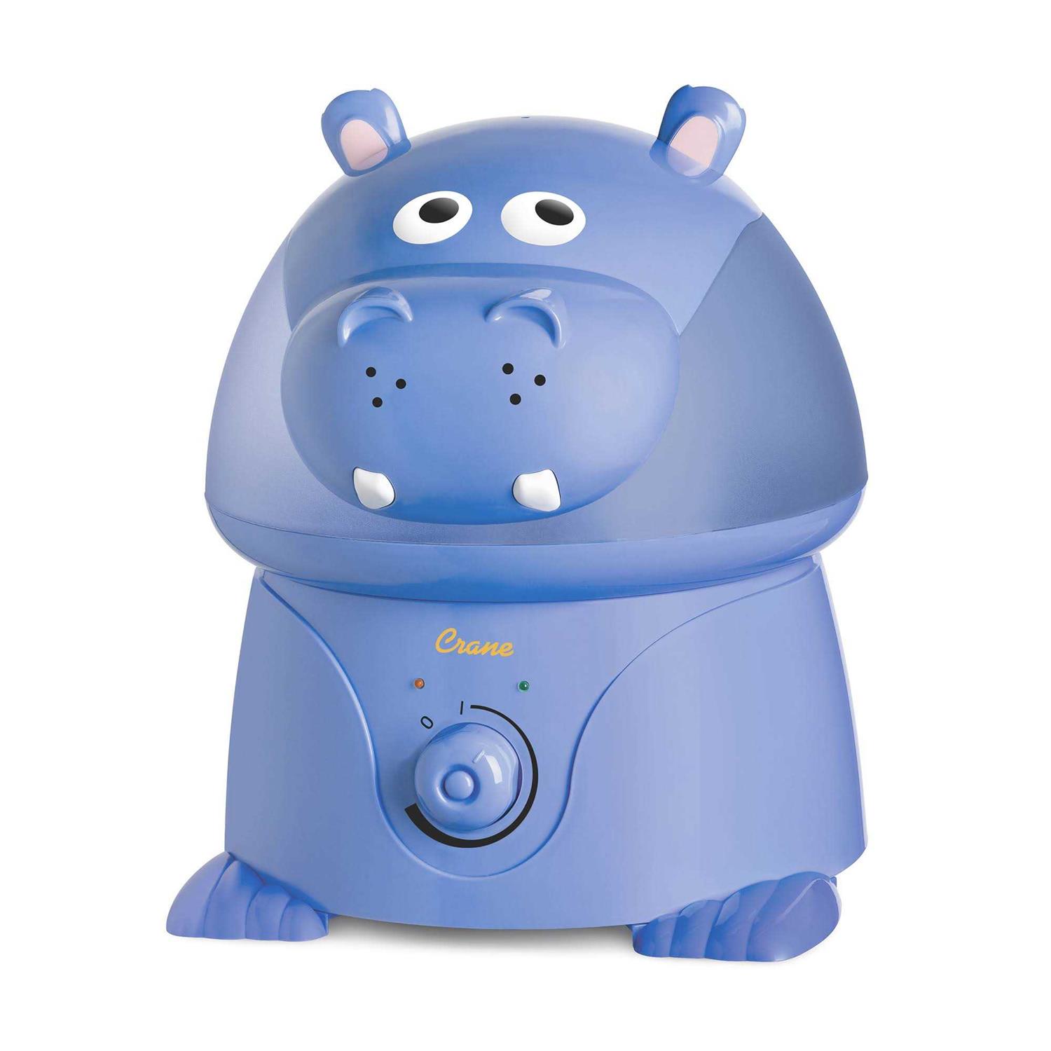 The hippopotamus is a semi-aquatic creature, spending most of its day at least partly submerged in water or mud in rivers and lakes. It’s possible that their ancestors spent even more time underwater: fossil evidence suggests that the hippo shares common ancestors with cetaceans (whales, dolphins, and porpoises). So the humid, humid hippo is an excellent choice to keep your child’s room nicely humidified! The adorable Crane Hippo Cool Mist Humidifier distributes a soothing mist throughout the room, helping kids breathe better and sleep better, especially during the indoor-heating months. Humidifiers provide effective relief for a wide variety of problems that can be attributed to or exacerbated by dry air, including coughs, colds, flu, nasal congestion, sinus irritation, nosebleeds, dry throats, dry skin, and chapped lips. And if the humidifier makes your child feel better, it can help you avoid having to resort to over-the-counter cold remedies. It’s easy to use the Crane Hippo Cool Mist Humidifier: just fill up the water tank, which is made to fit under the faucet in most sinks, pop it in, and use the control knob to adjust how much cool mist you want. The 1 gallon humidifier tank can produce up to 11 hours of mist, and the Cool Mist Humidifier will shut off automatically when water runs out, for safety and to lower power consumption. The Crane Cool Mist Humidifier also doesn’t require a filter, which cuts down on work! Suitable for any age.