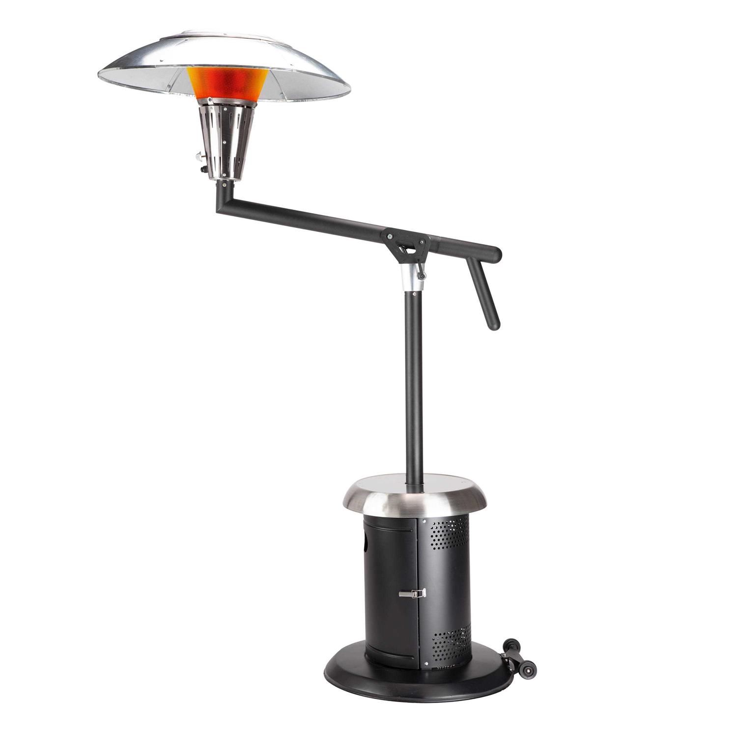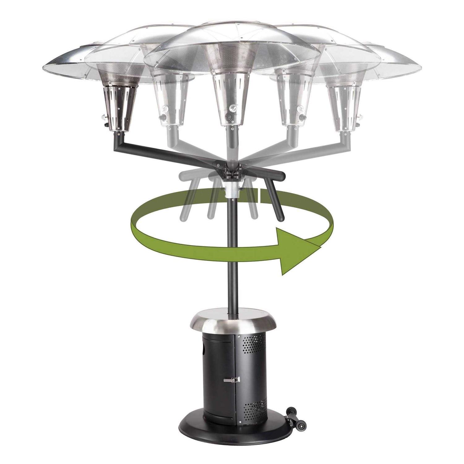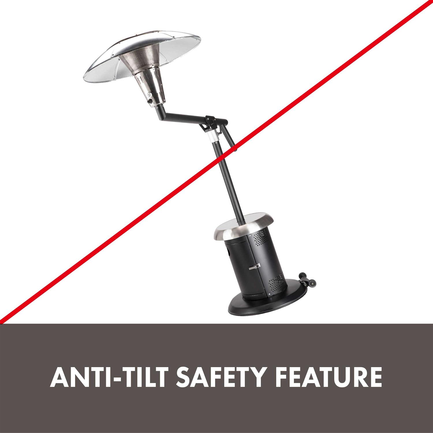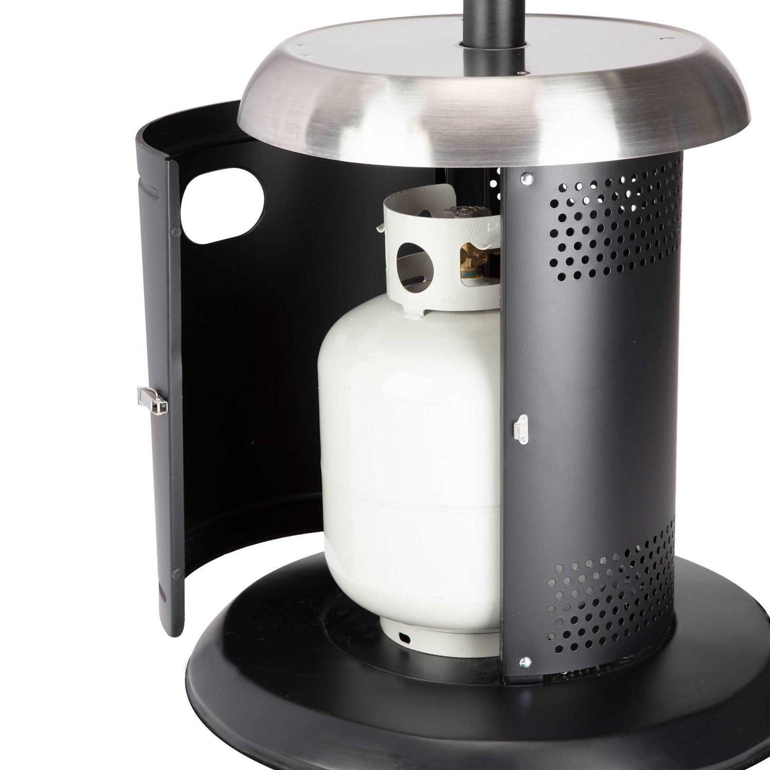 The Cuisinart perfect position propane patio heater is an overhead heater like no other! Unlike standard upright heaters, it has a swivel design that directs the heat where you need it most. From left to right, it has your patio covered. The extra-large 33 heat shield and cone-shaped burner unit helps direct the heat downward and outward, maximizing the 38,200 BTUs. This heater comes ready to use right out of the box with a 50 lb. sand-filled wheeled base. The enclosed base hides a 20 lb. propane tank, and has easy access to turn the gas on and off. A built-in drink table adds even more functionality and style to the unit. Your guests will love coming over for dinner parties knowing that they wont have to huddle under the heater, they will enjoy the warmth wherever you rotate the Perfect Position propane patio heater.
