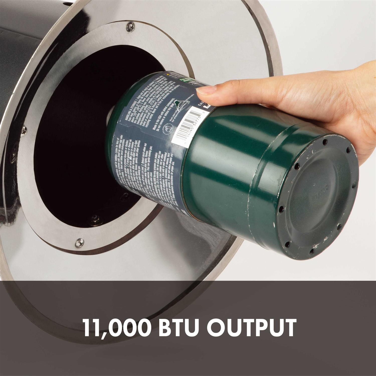 The Cuisinart tabletop patio heater will be a stylish addition to your outdoor entertaining space. Place it in the center of your patio table for warmth while you dine with friends and family, keeping you and your guests warm while the night settles in. Lightweight and small, this heater can be easily taken anywhere and set on a table, perfect for camping and tailgating. With an 11,000 BTU output, this heater is small but mighty and will heat an area of about 30 sq. Ft. The propane heater can also be connected to a 20-lb. Propane tank for longer use, with an optional hose/regulator (not included). Similar to the larger patio heaters, the top plate acts as a reflector, disturbing the heat evenly. For your protection, there is a built-in anti-tilt automatic shut-off technology that will shut the unit off if it is tipped over. Another safety feature is the burner screen guard, keeping you safe from the heating element itself.