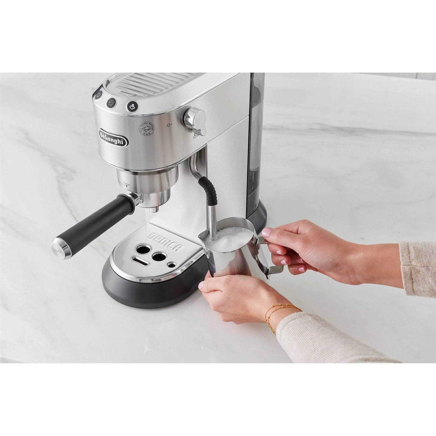 Featuring the famous functionality you expect from De’Longhi Dedica machines, this sleek, slim coffee maker delivers custom-made espresso drinks with big, bold flavor. It also boasts the My LatteArt steam wand, which allows you to create decorative images in the milk foam of each cup. Brewing authentic espresso with no downtime between cups, the professional-quality appliance includes an upgraded portafilter, adjustable frother, enhanced dosing capacity and premium tamper. 15-bar pressure pump features adjustable controls and ensures maximum extraction of flavor and aroma. Adjustable frother lets you customize milk foam and steam levels to create dry foam for cappuccinos and microfoam for lattes. Slim silhouette is ideal for small kitchens. Automatic flow stop dispenses 1 or 2 shots of espresso, eliminating guesswork. Adjust coffee amount and temperature to suit personal preferences. Two-level drip tray can be removed to accommodate travel mugs and tall glasses. Removable water tank is easy to refill and reattach. Versatile 3-in-1 filter holder accommodates single shots, double shots and espresso pods. Brews ground coffee; also compatible with Easy Serving Espresso (ESE) pods. Hot water function for preparing tea and infusions.