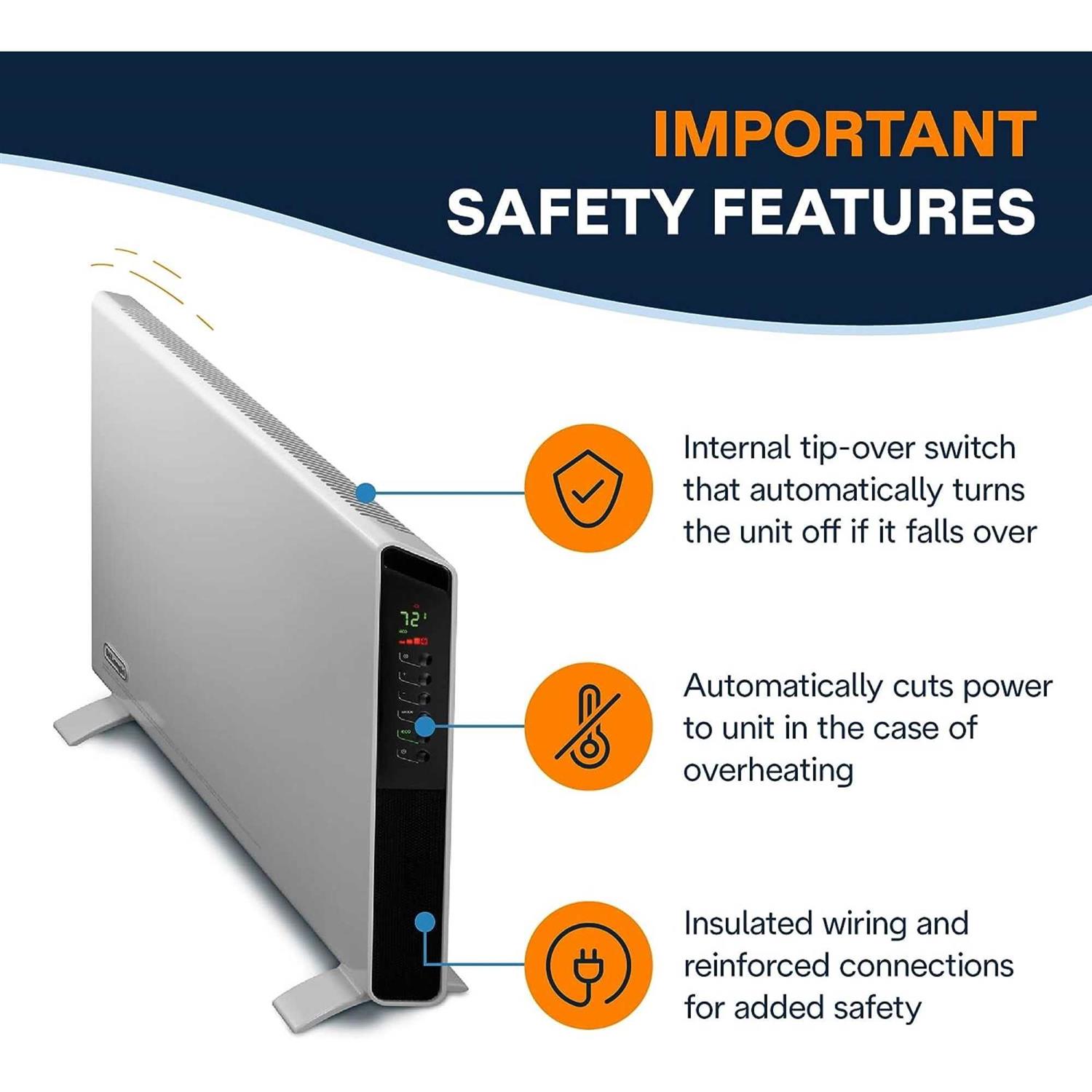 This DeLonghi convector heater gives you 1500 W of heating power to radiate in every room. The ECO feature allows to optimize your energy consumption and ensure an excellent comfort. The exclusive Hi-Fi technology provides a better distribution into the room thanks to the double fan system. The appliance can be fixed to the wall with the special kit provided. Its 2,95” (7.5 cm) depth is ideal for small spaces.