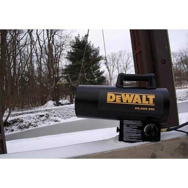 The DeWalt 60000 BTU/HR Compact jobsite forced air propane heater offers all of the convenience and portability the trades require. Adjustable from as low as 30000 BTU/HR all the way up to 60000 BTU/HR the heater has the versatility to be used on any size project. Equipped with all the safety features you would expect from a DeWalt product and includes a factory matched 10′ pre assembled hose and regulator. Simply hook the heater up to a 20 propane tank or larger plug it in and your space will be warm in no time.