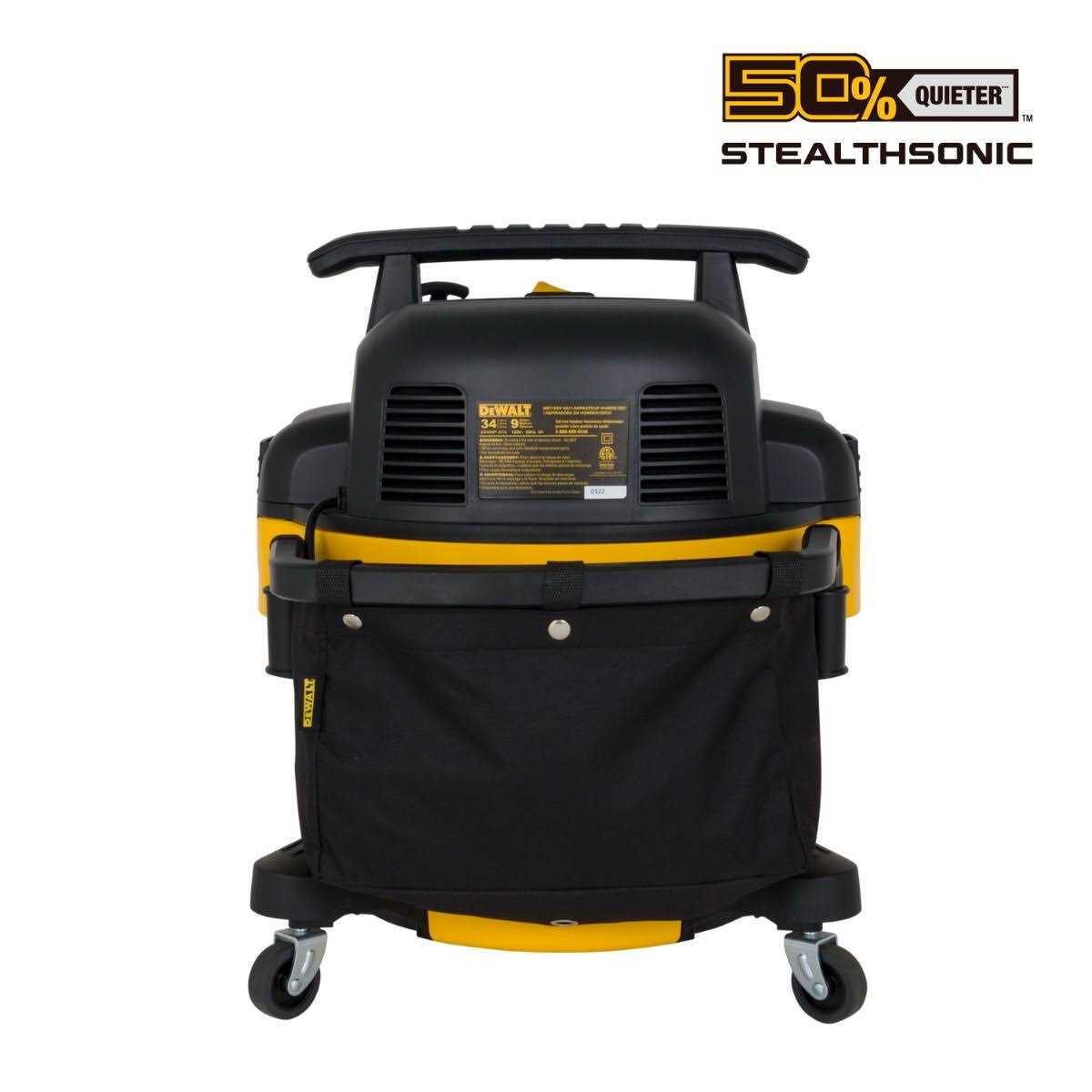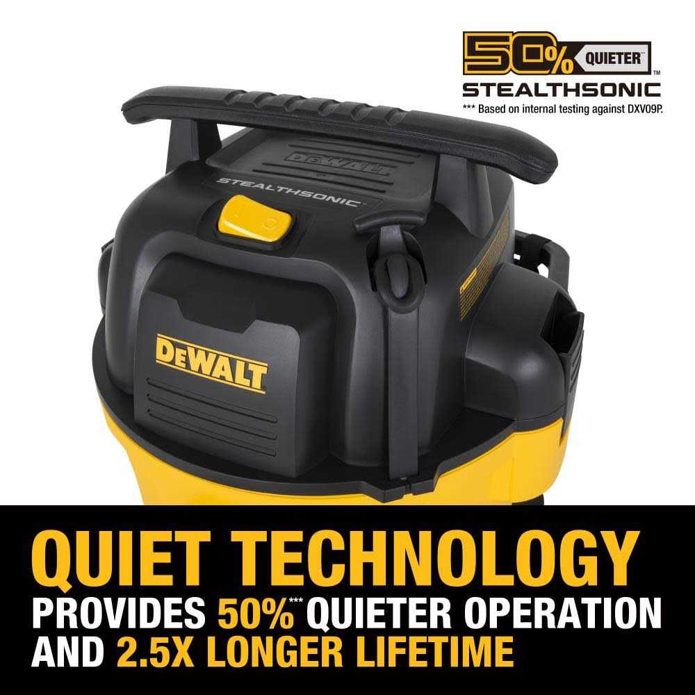 STEALTHSONIC Poly Wet/Dry Vacuum has a powerful quiet motor providing strong suction power and airflow to clean up the toughest wet and dry debris while be 50% quieter than the current model. The DXV09P-QTA features a durable quick-connect locking hose making it an easy but secure connection. The built-in drain port allows for convenient emptying of liquids. High Performance Rubberized non-marring casters allow with smooth and easy movement across any surface. The large fixed handle provides a convenient cord wrap and is durable to ensure transportation at any job site. A rugged nylon water resistant storage bag allows for easy and convenient access of all accessories and tools. The reusable and washable Cartridge Filter eliminates 95% of dust and contaminants. The filter features the exclusive Clean and Connect system only on all DeWalt Wet Dry Job Site Vacuums. It gives the pro ability to quickly and easily change filters without screws or adaptor plates all without getting your hands on the dirty filter.