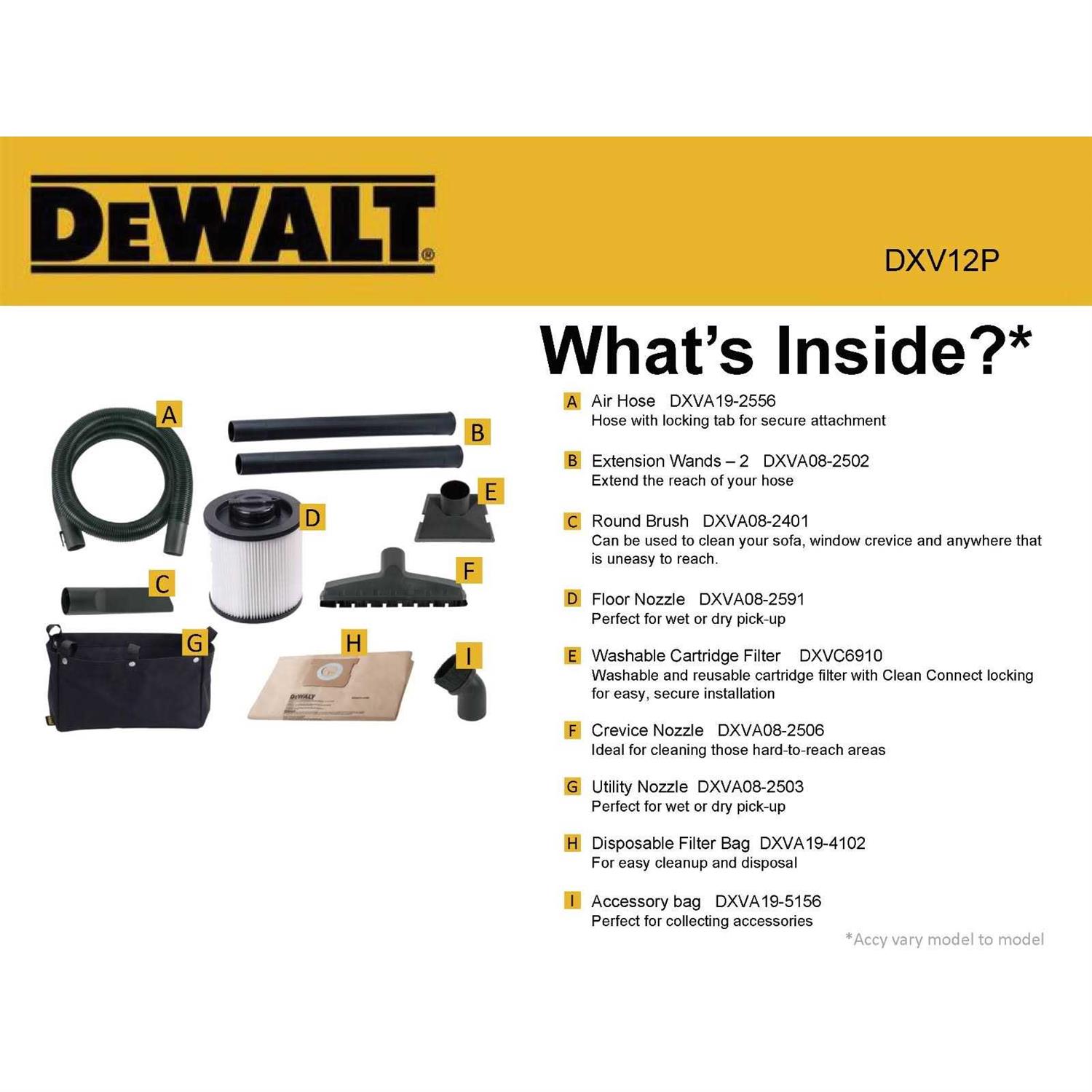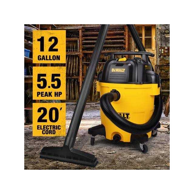 DeWALT 12 gallon portable wet/dry vacuum features 5.5HP single stage motor, 105 CFM, and built-in accessory storage. Includes hose, extension wand, floor brush, utility nozzle, crevice nozzle, and round brush. The 12 gallon wet/dry vac has a convenient handle and large rear wheels for large clean-up applications. It arrives with a cartridge filter for small, dry debris and wet materials. This vac also features a strong handle for easy carrying, large on/off switch with water-resistant design for safe and Quick access, convenient, built-in 20′ power cord and accessory bag to get all your accessories/tools organized. Swiveling casters provide ease of movement in any direction while a built-in tank drain makes draining easy. 7 feet Interior hose diameter is 2.5 inches. Sturdy 12 gallon wet/dry Vac ideal for large pick-up applications Powerful 5.5 peak horsepower motor provides just the amount of suction needed to most any cleanup job Ultra durable rubberized casters allow smooth swiveling for ease of movement.To keep your wet/dry vac looking its best, clean the outside with a cloth dampened with warm water and mild soap Extra long, 20′ Power cord with cord wrap helps reach almost any cleanup need Built-in blower port powerful enough to blow Sawdust and debris from most any workshop Built-in accessory storage bag conveniently attached to the backside of the vac to keep all accessories neatly organized Large built-in tank drain makes it easy to remove liquids picked up Tank capacity refers to actual tank volume and does not reflect capacity available during operation. Peak Horsepower” (PHP) is a term used in the wet/dry vacuum industry for consumer comparison purposes. PHP does not denote the operational horsepower of a wet/dry vacuum but rather the horsepower output of a motor, including the motor’s inertial contribution, achieved in laboratory testing. In actual use, motors do not operate at the peak horsepower shown.