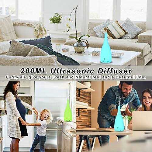 200ML Great Improve Air Qualities Essential oil diffuser humidifiers can product a large number of negative oxygen ion sterilize remove dust and purify air effectively. Portable for bedroom office spa kitchen and more! Remote Control Diffuser Remote Control: You can do whatever you want to change or adjust them with this remote control on the bed soft and every corner in your room. Whisper-quiet and Moisturizes Aromatherapy diffuser adopted ultrasonic technology run steady and noiselessly give you a quiet and comfortable environment. It gives out cool and smooth mist to help with dry skin help relieve sore throat creating a soothing environment in your bedroom or workspace. Waterless Auto Shut-off in Security Once the water runs out the diffuser automatically shuts off to protect from burning out and ensure safety energy efficiency and peace of mind. The diffuser is made of environment friendly PP material with natural. Streamlined design of 7 LED LightsAromatherapy essential oil diffuser have 7 different light colors. You can choose to cycle them through or freeze on one fixed color to create a different atmosphere of interior space. It is also a beautiful night lightyou can easy to click the LIGHT on and off.