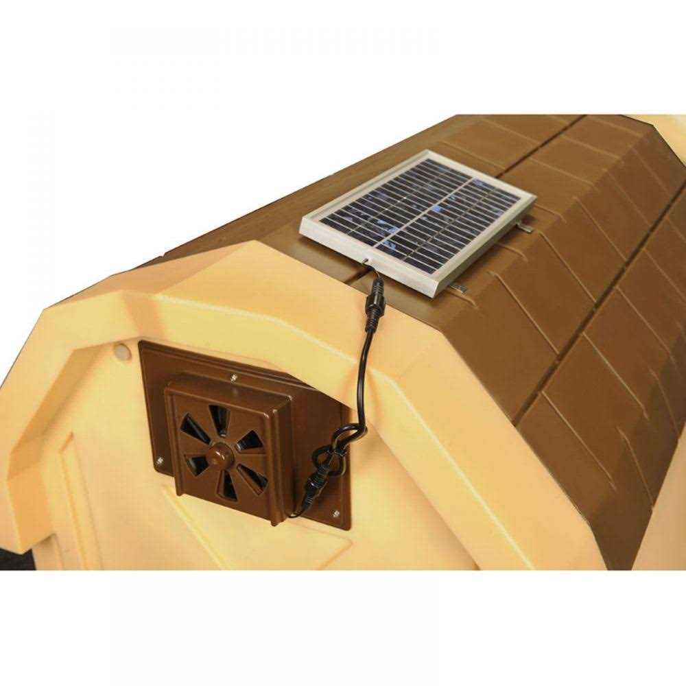 Keep your pet cool and comfortable during warm weather with the Dog Palace Breeze, Solar-Powered Exhaust Fan. It’s designed specifically for the Dog Palace. The dog house fan will keep your pet cool by replacing the air in the entire house up to five times a minute and providing an indirect breeze during a hot sunny day. Exhaust vents provide passive exhaust when the sun is not shining and vents close with the twist of a knob for winter protection. The long-lasting, whisper-quiet, ball-bearing fan does not disturb your dog while they are resting. The solar fan for dog house includes an 8′ cord for optimal panel placement in the sun.