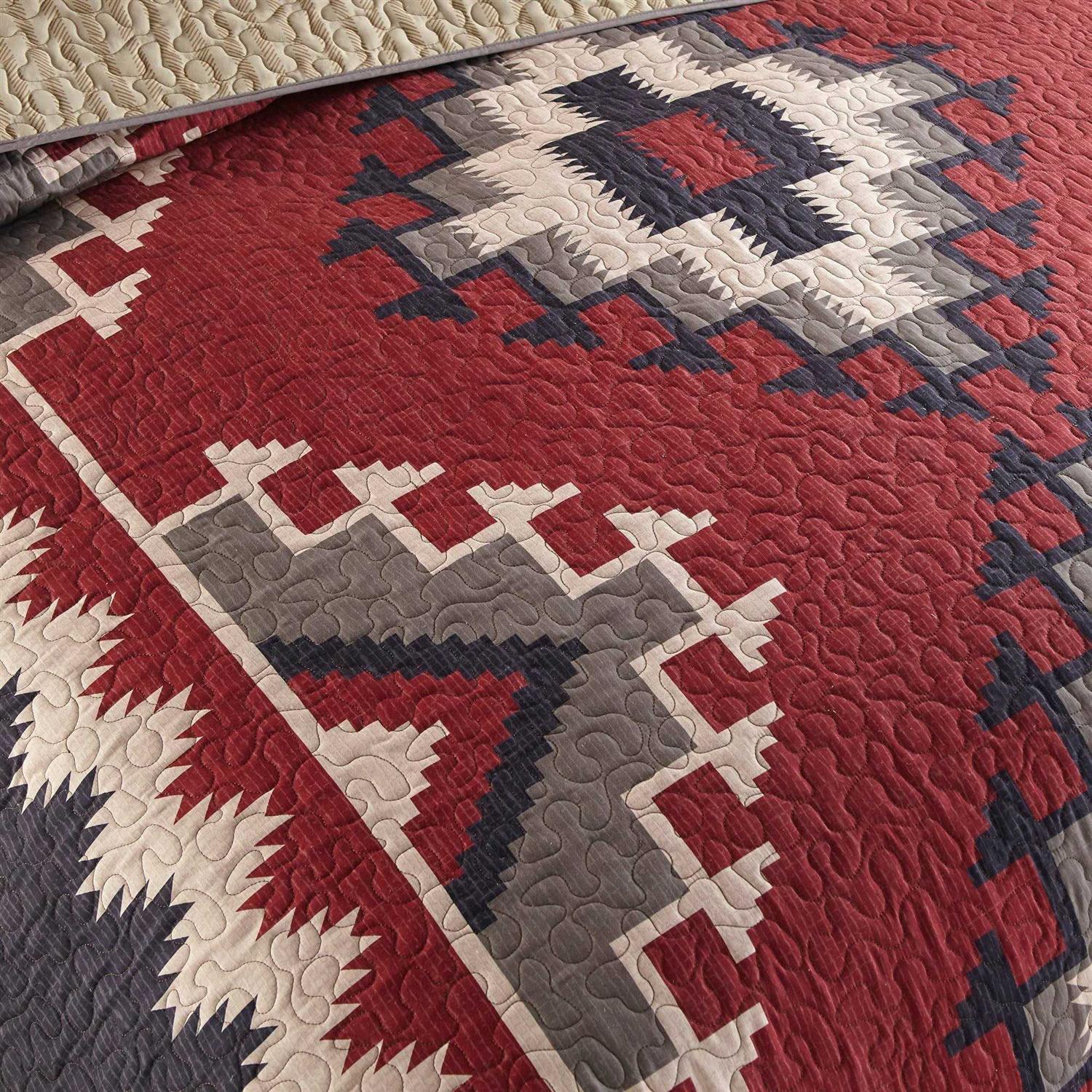Queen quilt set includes 1 queen reversible quilt 90″x 90″ and 2 standard pillow shams 20″x 26″. This 3pc quilt set from Your Lifestyle is designed with a large-scale pattern based on a traditional southwest woven pattern. This quilt bedding set has a cover that is polyester and the fill is polyester fiber and cotton. Our southwest bedding is perfect for any house, apartment, cottage, or lodge. Care Instructions: Machine wash warm and tumble dry low. Do not bleach. The Mojave Red 3pc quilt set from Your Lifestyle is designed with a large-scale pattern based on a traditional southwest woven pattern. Colors include charcoal, camel, warm tan and brick red. The lining is a tan ticking stripe. Easy care machine washable fabric. Reversible. Each set includes a quilt and 2 shams. Decor pillows sold separately. Imported.