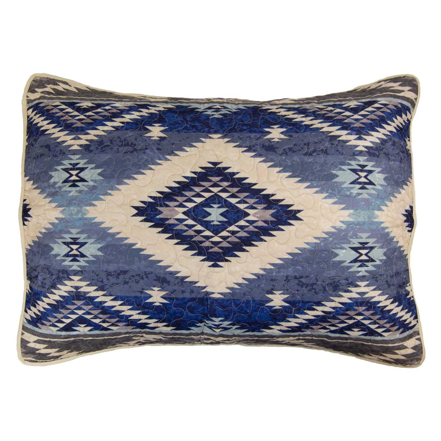 Queen quilt set includes 1 queen reversible quilt 90″x 90″ and 2 standard pillow shams 20″x 26″. This 3pc quilt bedding ensemble from Donna Sharp features a bold, slightly-weathered Southwest pattern. This quilt bedding set has a cover that is polyester and the fill is polyester. Our southwest bedding is perfect for any house, apartment, cottage, or lodge. Care Instructions: Machine wash warm and tumble dry low. Do not bleach. Desert Hill 3pc quilt bedding ensemble from Donna Sharp features a bold, slightly-weathered Southwest pattern. Colors include navy, pale blue, ivory and grey. Available in Full/Queen and King size, each set includes a quilt and 2 shams. The easy care fabric is machine washable and will look great in any bedroom in the house. Decorative accessories sold separately.