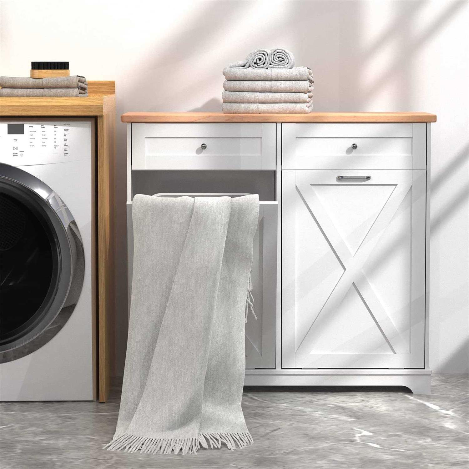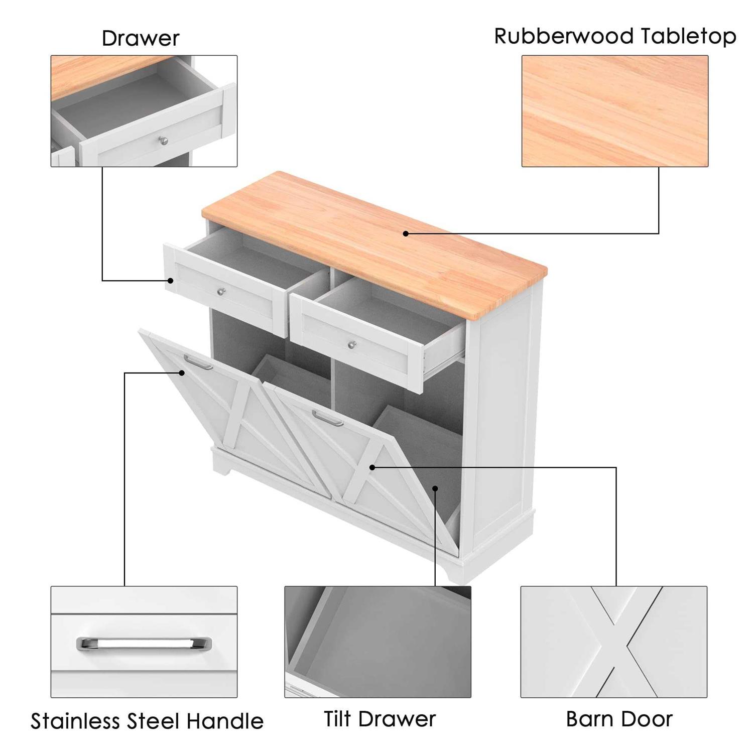Feature: Space Saving and Concealment:Double Tilt-out trash cabinet 35.8 “H x 39.3 “L x 13 “W (for 2 x 10 gallon trash cans), which can hide the trash cans well, keep the kitchen delicate and the floor clean. It also blocks odors from emanating, while your pets will never knock over the trash cans anymore New Update Farmhouse Style Barn Door: The cabinets are simple and practical in design, perfect for dressing up your kitchen, home, apartment, dorm room, laundry room, etc. Combined with 2 pull-out drawers, you can store kitchen supplies, pet food, and the slanted drawer below can even be used as a laundry cabinet Kitchen Safety Material:Our trash bin cabinet made of MDF wood with a polished coating, our garbage cabinets are simple, luxurious, and easy to clean. All wood panels used in our products are perfectly compliant with the California Air Resources Board (CARB) P2 requirements Durable and Stable:cabinet support is stable enough to hold up to a 35 lb (ca. 16 kg). Our Trash can, a perfect match for a 13-gallon trash can. Rubberwood top surface provides extra cutting space, and can easily withstand even a microwave and coffee maker Notice Happy Service:Please clean up in time to prevent bacteria growth. Excessive trash can cause damage to the cabinet door Specification: Capacity: 20 Gallons Color: 10 Gallon-Double White Opening: Mechanism Pull-Out Material: Engineered Wood Product Dimensions: 35.8 “H x 39.3 “L x 13 “W